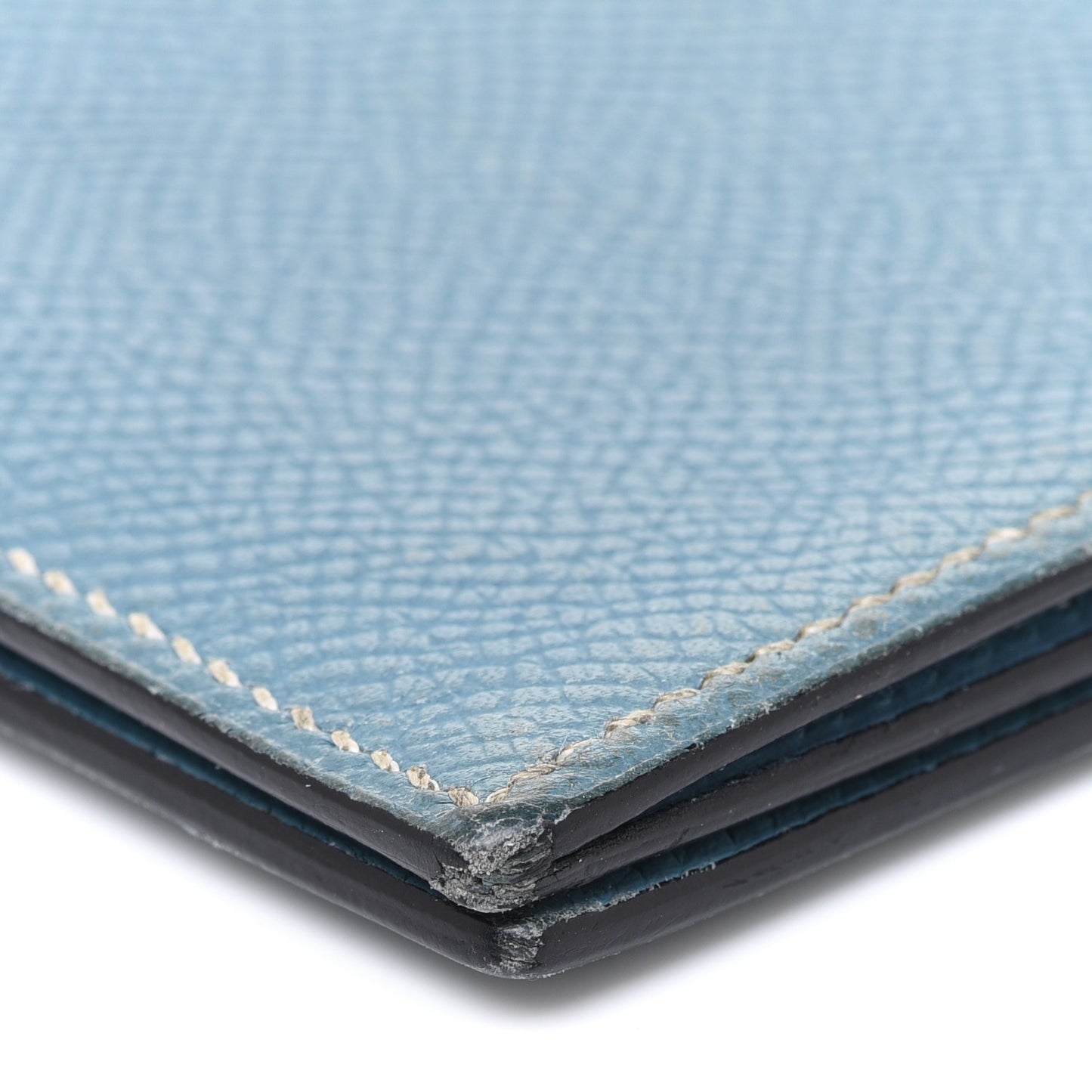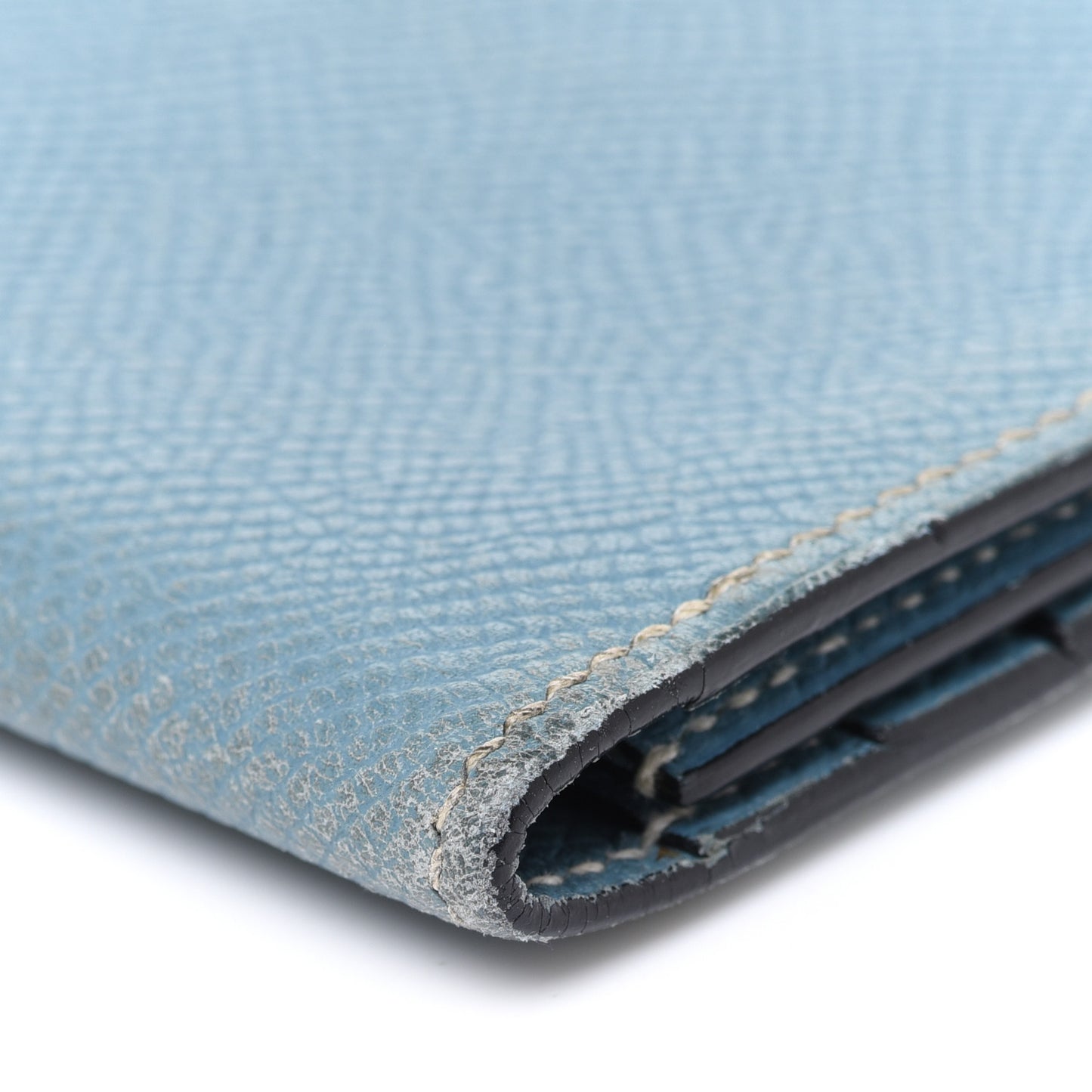 This is an authentic HERMES Epsom MC2 Fleming Long Wallet in Blue Jean. This stylish clutch wallet is crafted of fine calfskin leather in blue. The wallet opens to a matching compact leather interior that features card slots and patch pockets.