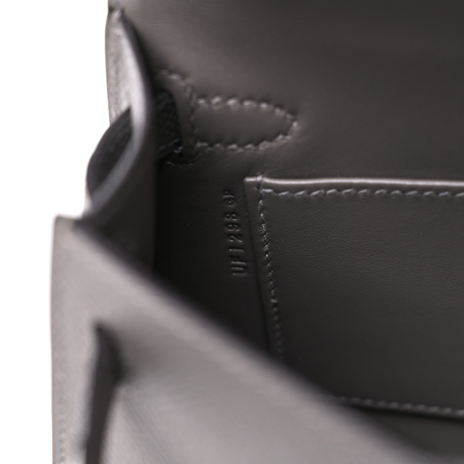 This is an authentic HERMES Epsom Mini Kelly Sellier 20 in Gris Meyer. This stunning Hermes classic handbag is beautifully crafted in stamped Epsom calfskin leather in classic grey. A single rolled leather top handle is secured with palladium hardware and an optional leather shoulder strap is included. The traditional Kelly turn-lock secures the small flap. The interior is composed of soft lambskin leather and pocket.Follow this item for alerts. Hermes is a registered trademark of Hermes. FASHIONPHILE is not affiliated with Hermes.