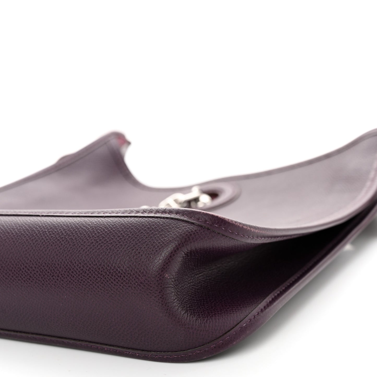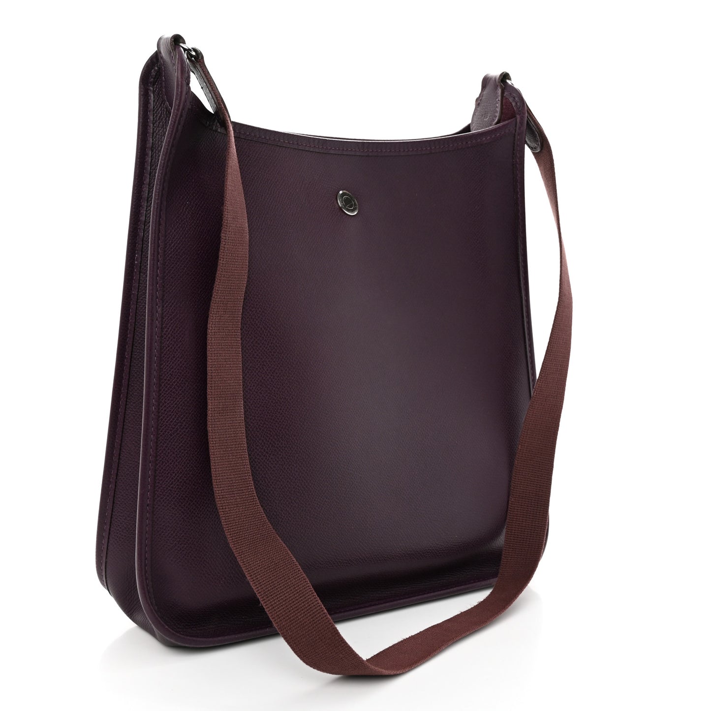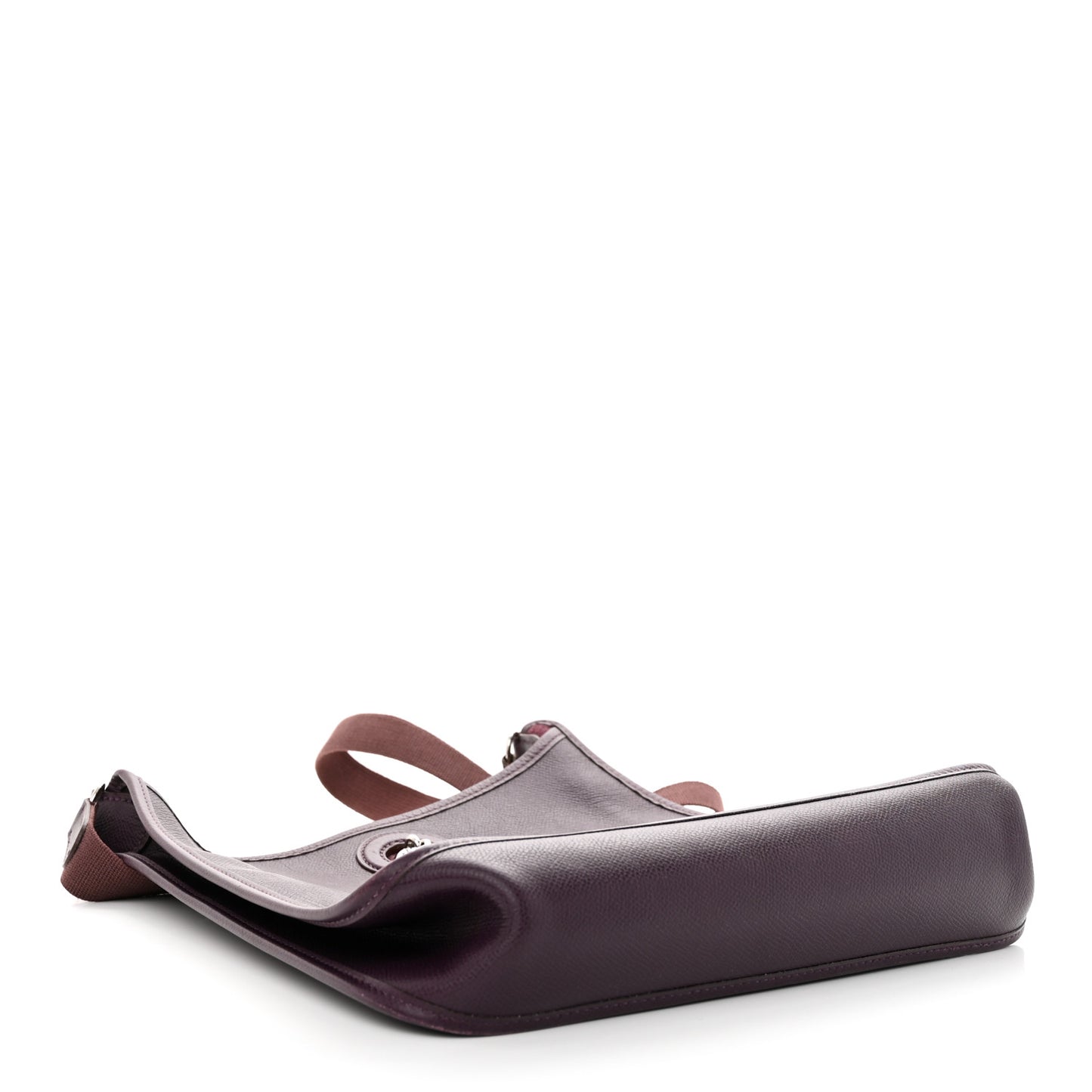 This is an authentic HERMES Epsom Vespa PM in Raisin. This chic cross-body bag is crafted of textured epsom calf leather in purple. The bag features a lengthy nylon canvas cross-body strap with silver links and a facing silver bar closure. This opens to a suede interior with a herringbone toile pocket.