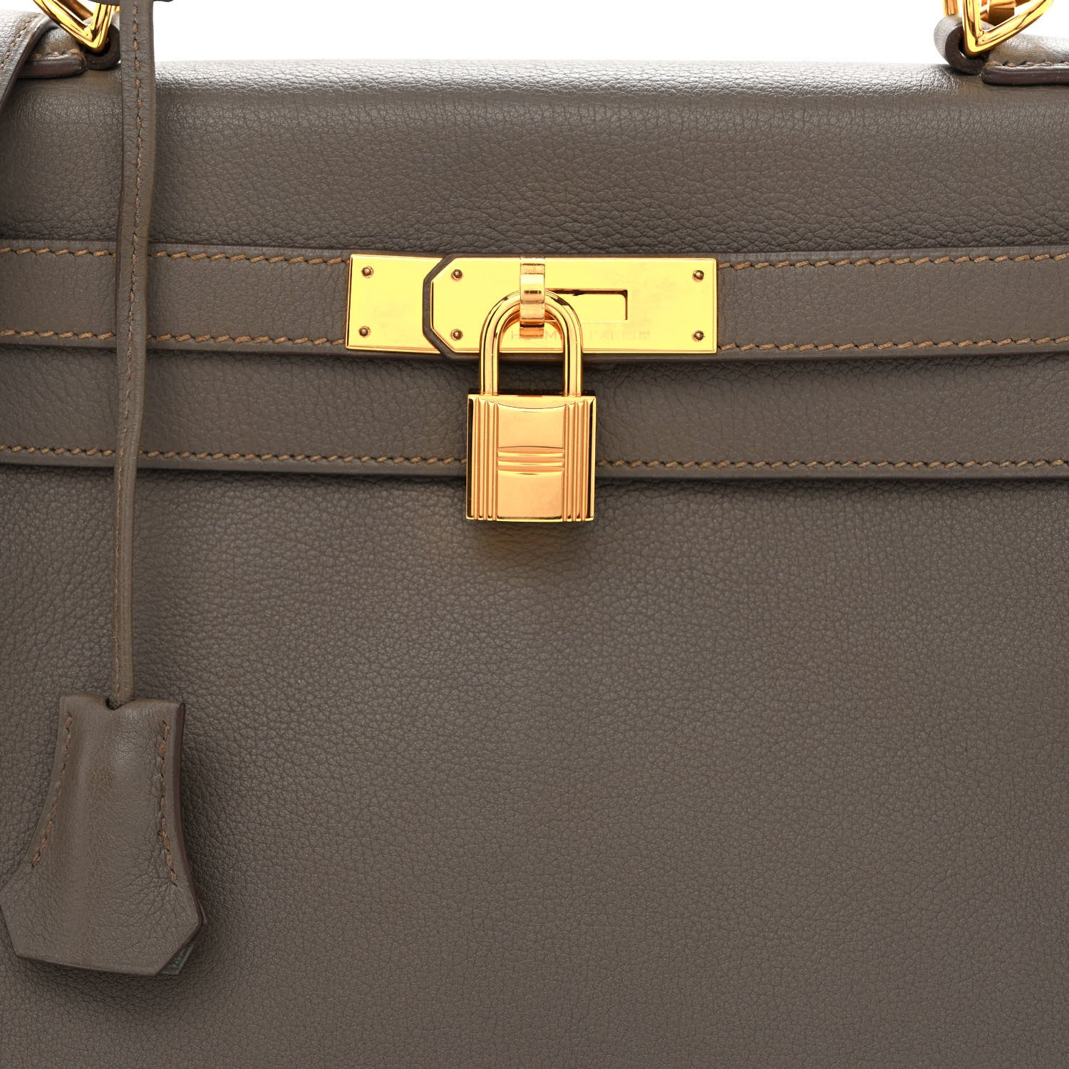 This is an authentic HERMES Evercolor Kelly Retourne 28 in Etain. This beautifully stylish handbag is crafted of soft grain leather in grey. It features a sturdy top handle as well as an optional leather shoulder strap both with polished gold hardware and a cross-over flap with a signature Kelly gold plated turn lock and padlock with a clochette for the keys. The interior features a matching leather with patch and zipper pockets.