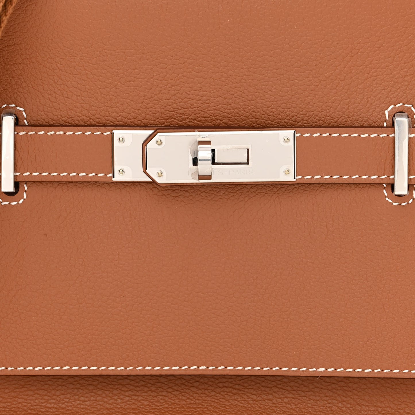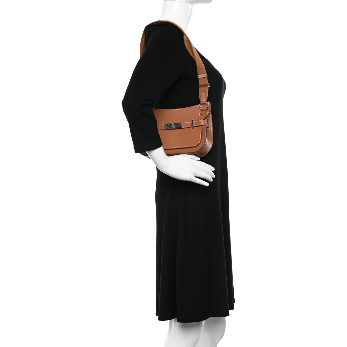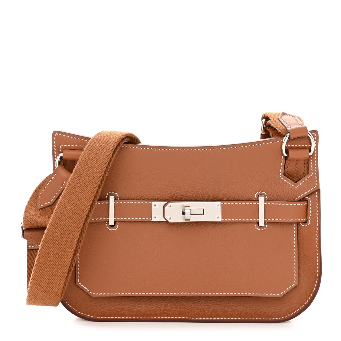 This is an authentic HERMES Evercolor Mini Jypsiere in Gold. This stylish messenger bag is beautifully crafted of brown leather with a white contrasting stitch. The bag features an adjustable canvas crossbody strap, a full front flap, and polished palladium silver hardware. The front clasp opens to a matching leather interior with a patch pocket.Follow this item for alerts. Hermes is a registered trademark of Hermes. FASHIONPHILE is not affiliated with Hermes.