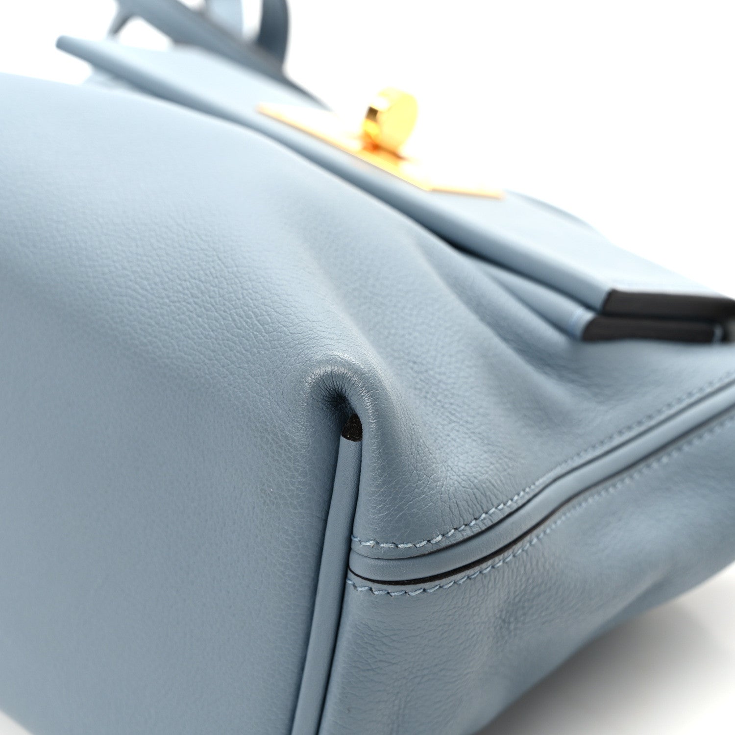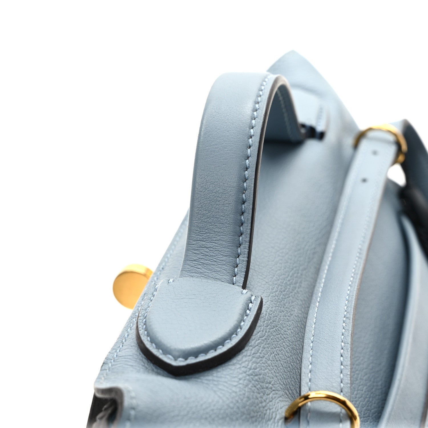 This is an authentic HERMES Evercolor Swift 24/24 21 in Bleu Lin. This handbag is crafted of richly textured evercolor and swift leather in light bleu. The bag features a reinforced leather top handle, an optional leather shoulder strap, a. rear patch pocket, and gold tone hardware. This bag can also be styled as a belt bag. The flap opens with a twist lock to a matching smooth leather interior with a zipper pocket.