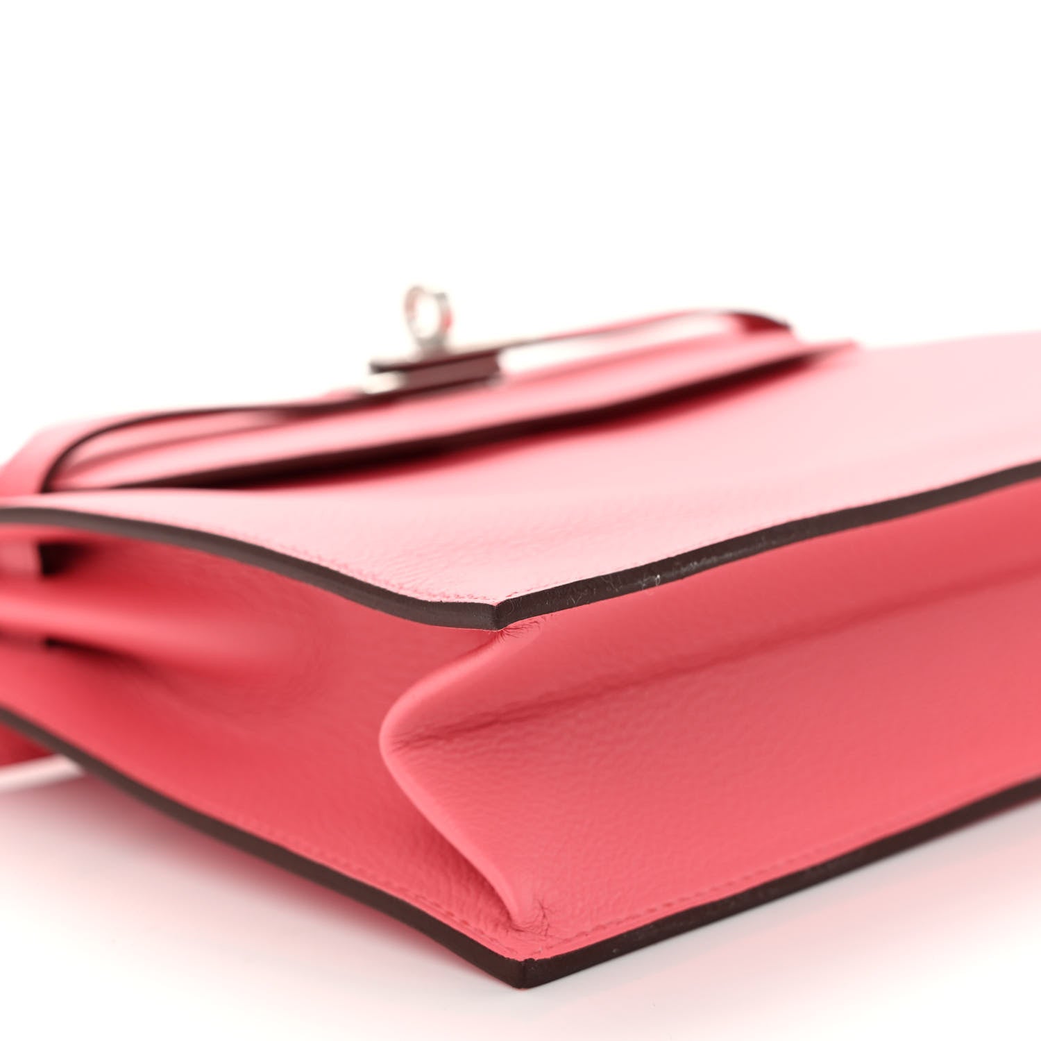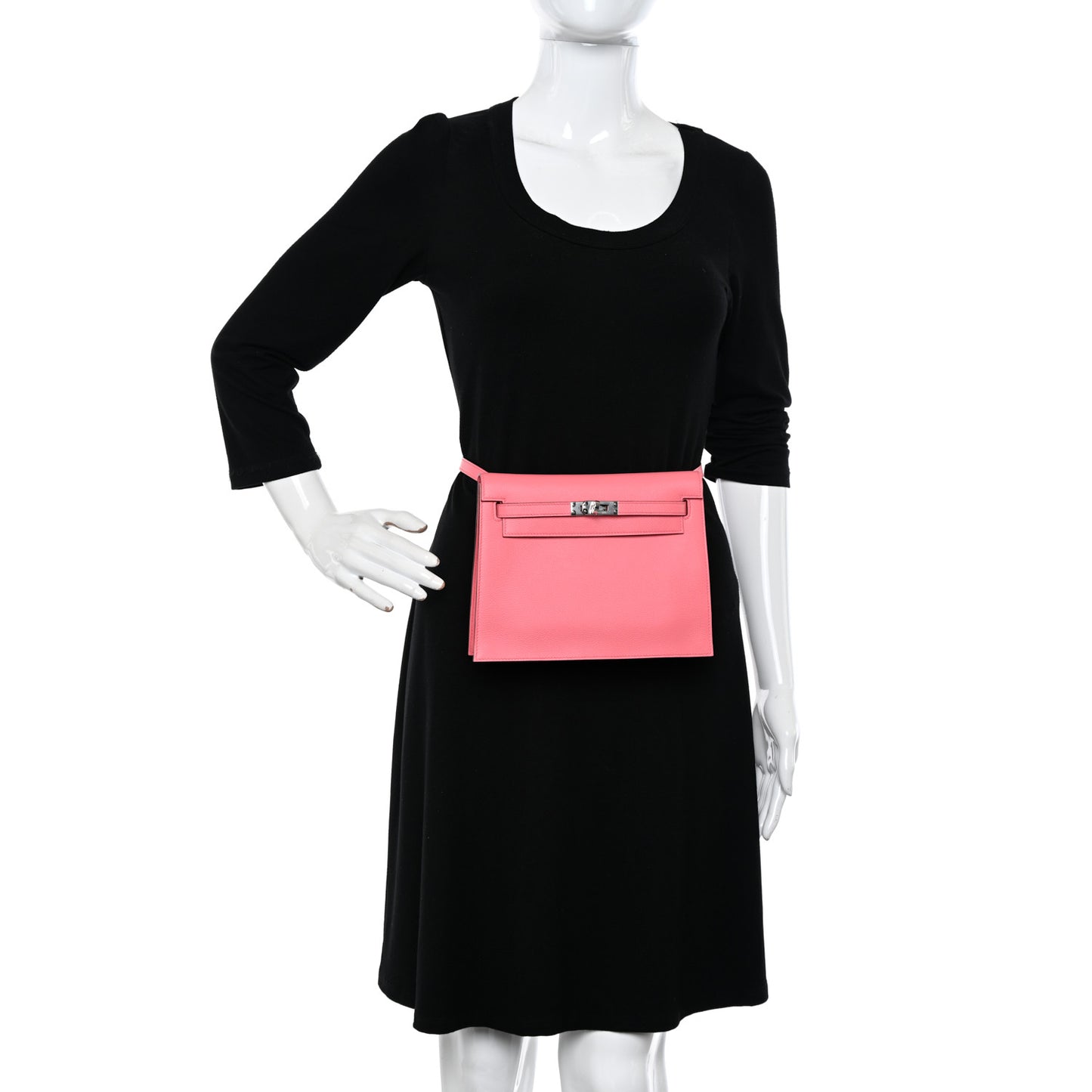 This is an authentic HERMES Evercolor Verso Kelly Danse II Belt Bag in Rose Azalee and Vert Cypress. This chic Kelly handbag is crafted of evercolor calfskin leather in pink. The bag features a reinforced an optional shoulder strap, a crossover flap and strap closure, palladium silver palladium plated hardware including a signature Kelly turn lock. The flap opens to a dark green matte leather interior with a flat pocket.Follow this item for alerts. Hermes is a registered trademark of Hermes. FASHIONPHILE is not affiliated with Hermes.