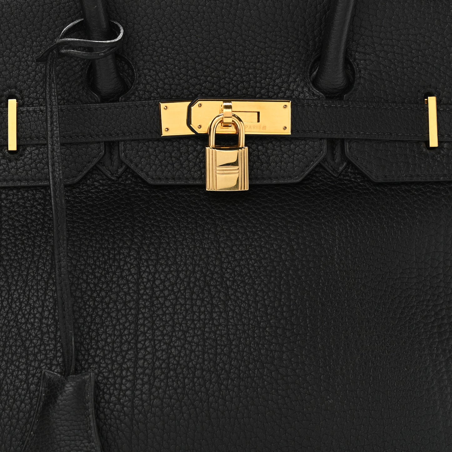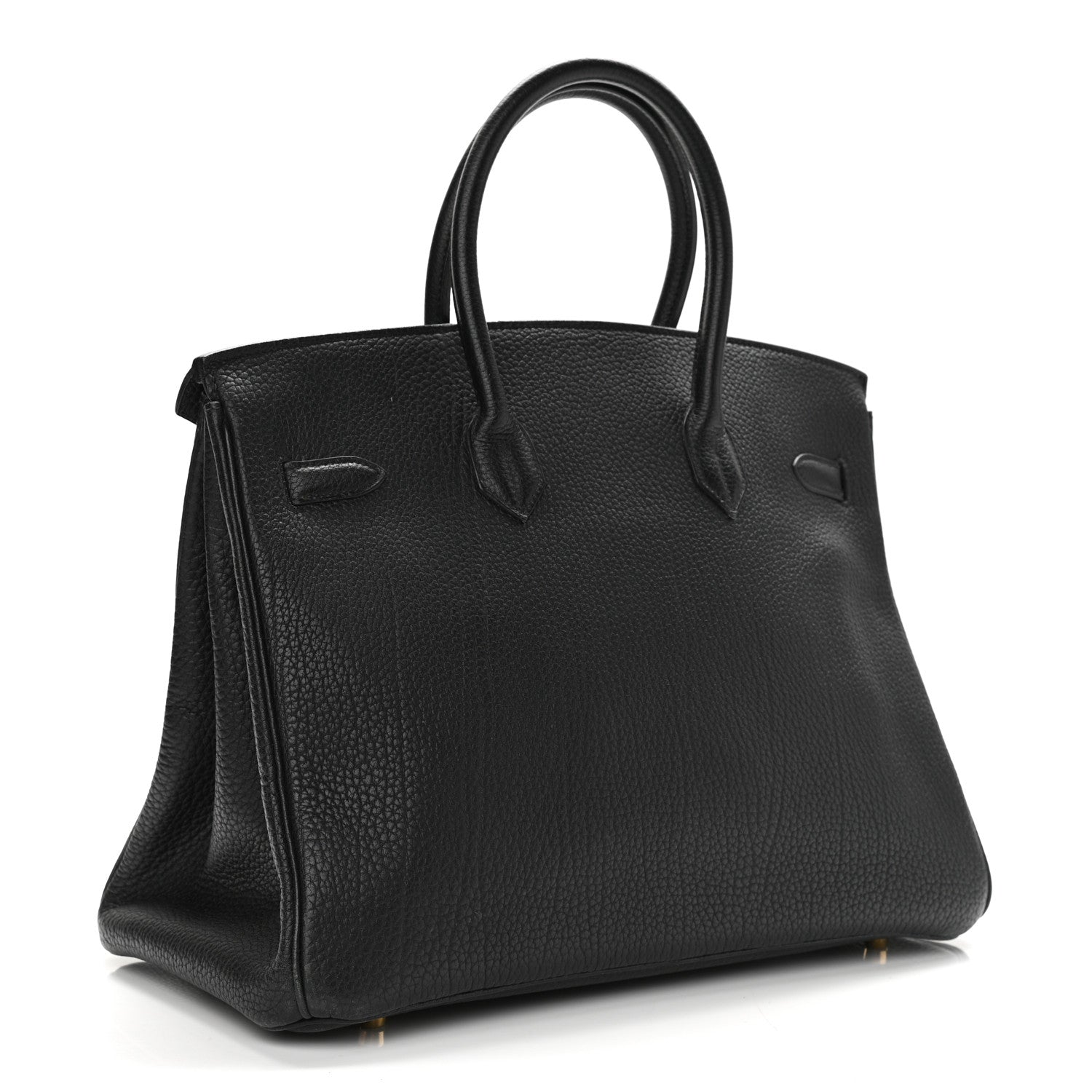 This is an authentic HERMES Fjord Birkin 35 in Black. This stunning handbag is crafted of grained leather in black. The bag features thin but sturdy rolled leather top handles, a crossover flap with a strap closure, clasps with a gold plated turn-lock, and a hanging clochette with keys. The bag opens to a spacious matching leather interior with zipper and patch pockets.Follow this item for alerts. Hermes is a registered trademark of Hermes. FASHIONPHILE is not affiliated with Hermes.