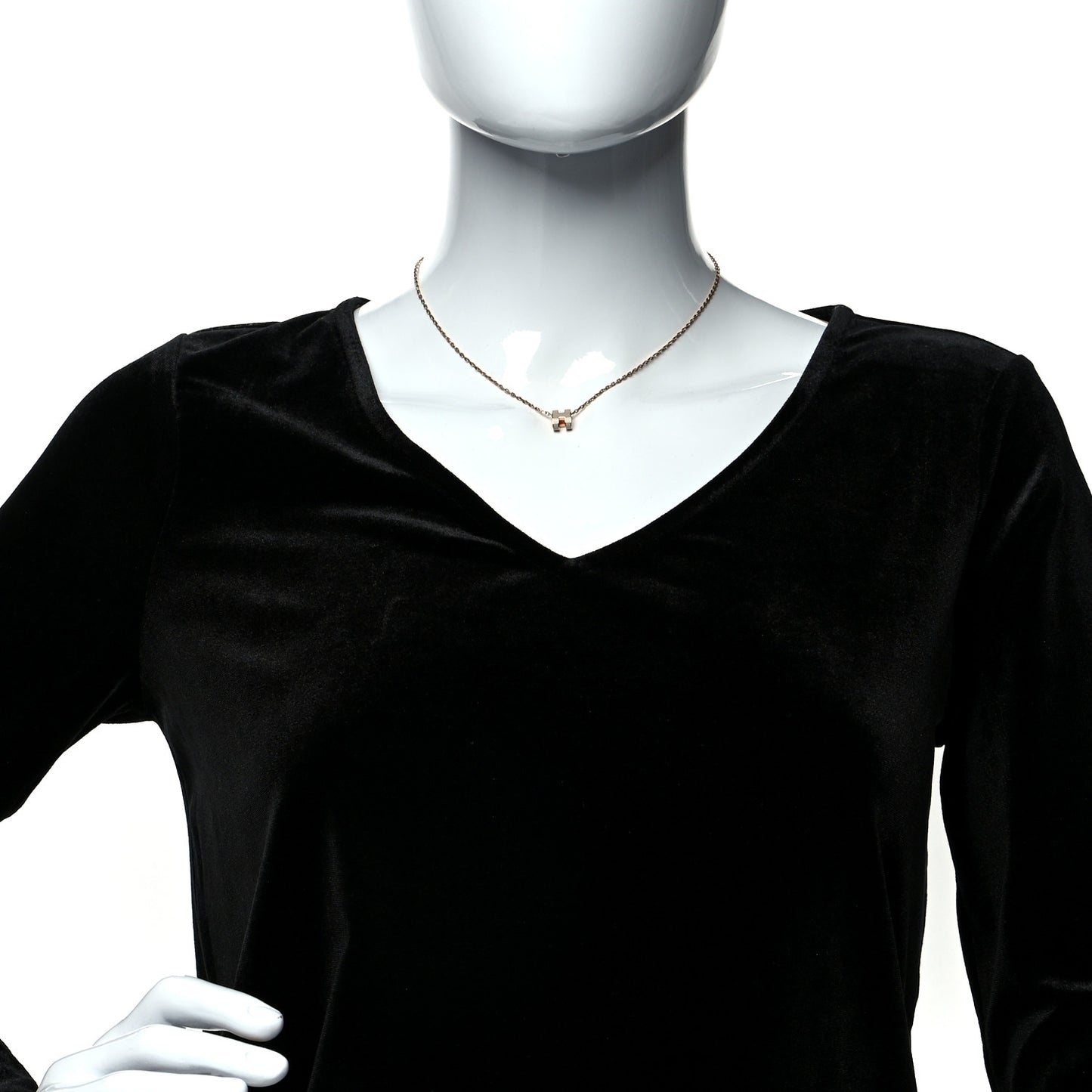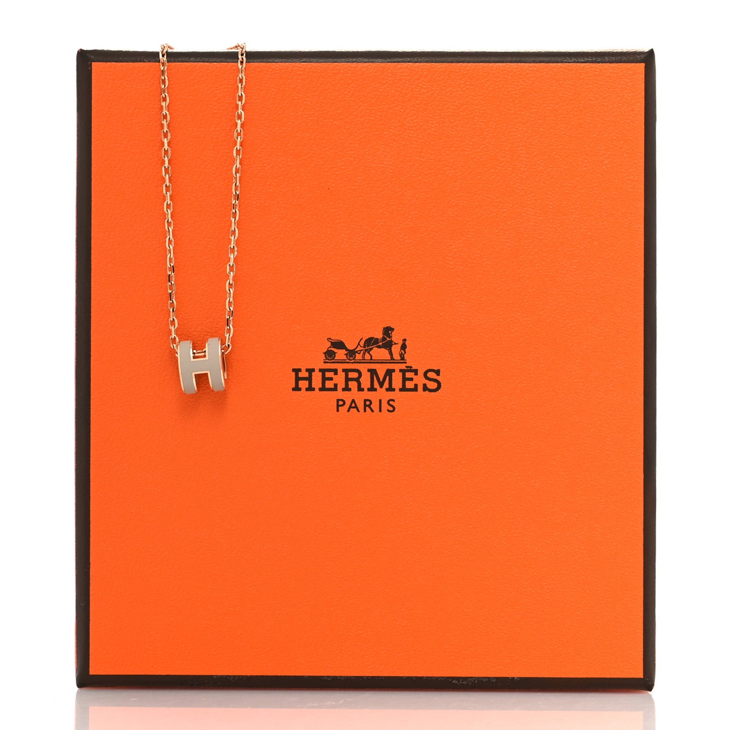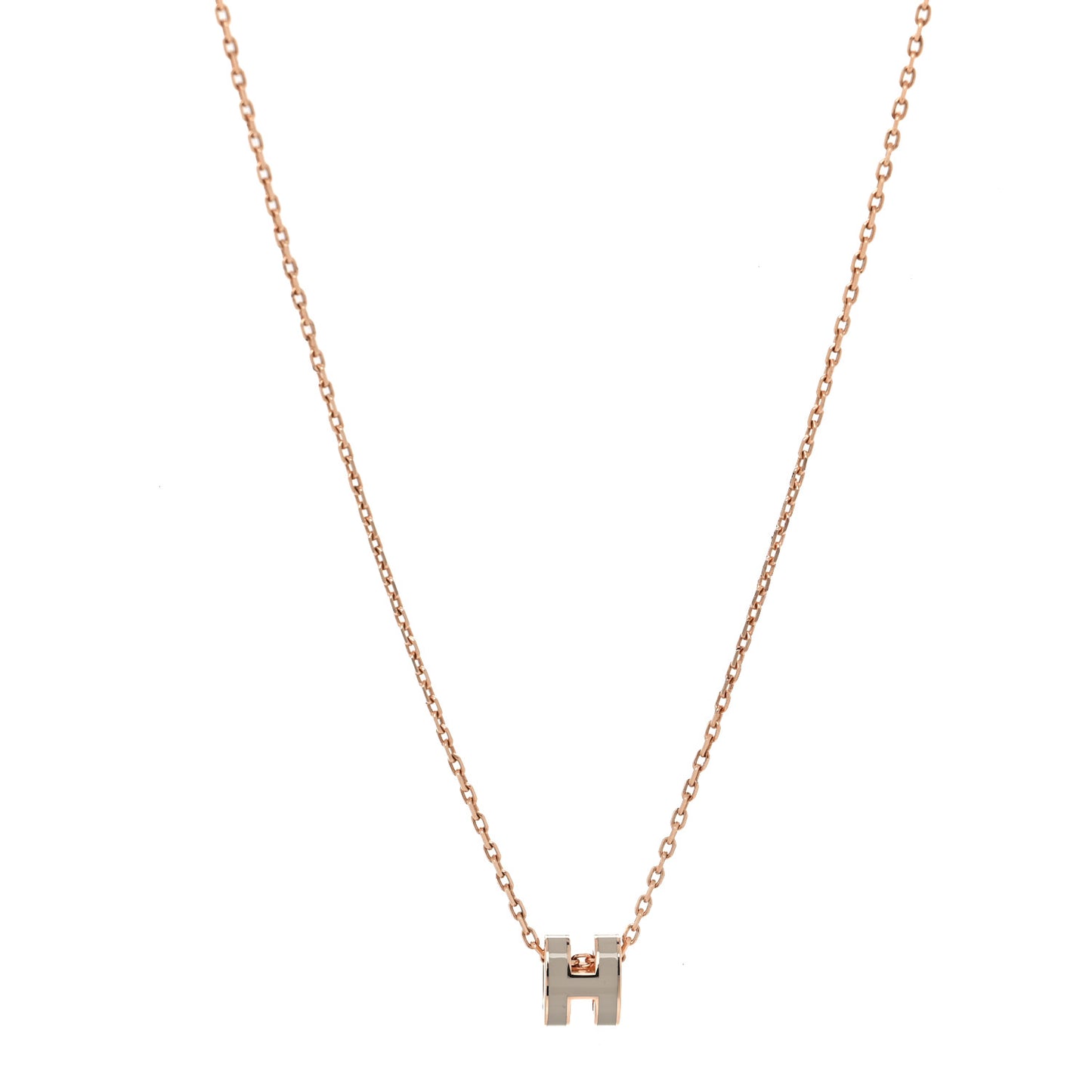 This is an authentic HERMES Lacquered Rose Gold Mini Pop H Pendant Necklace in Marron Glace. This is a simple and very chic necklace from Hermes. It features a ring shape that is an elongated lacquered grey “H", which hangs on a short, thin rose gold band.Follow this item for alerts. Hermes is a registered trademark of Hermes. FASHIONPHILE is not affiliated with Hermes.