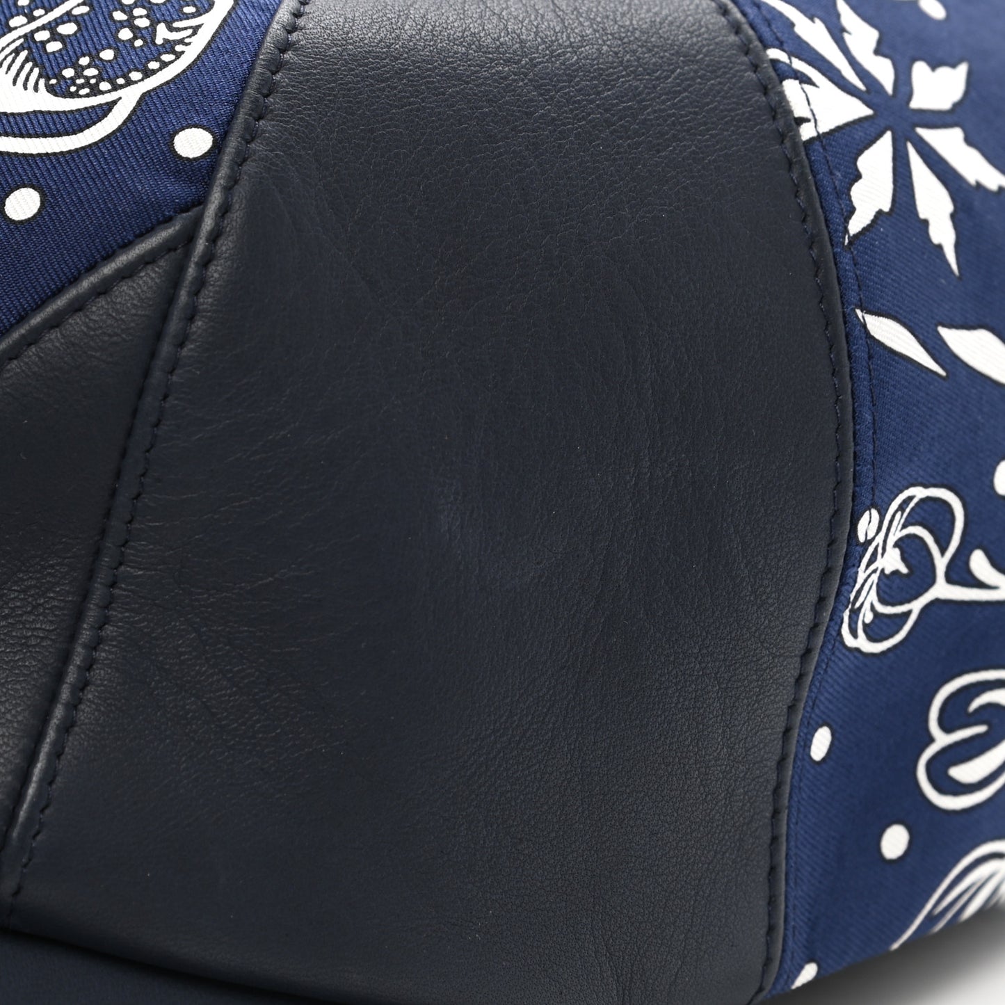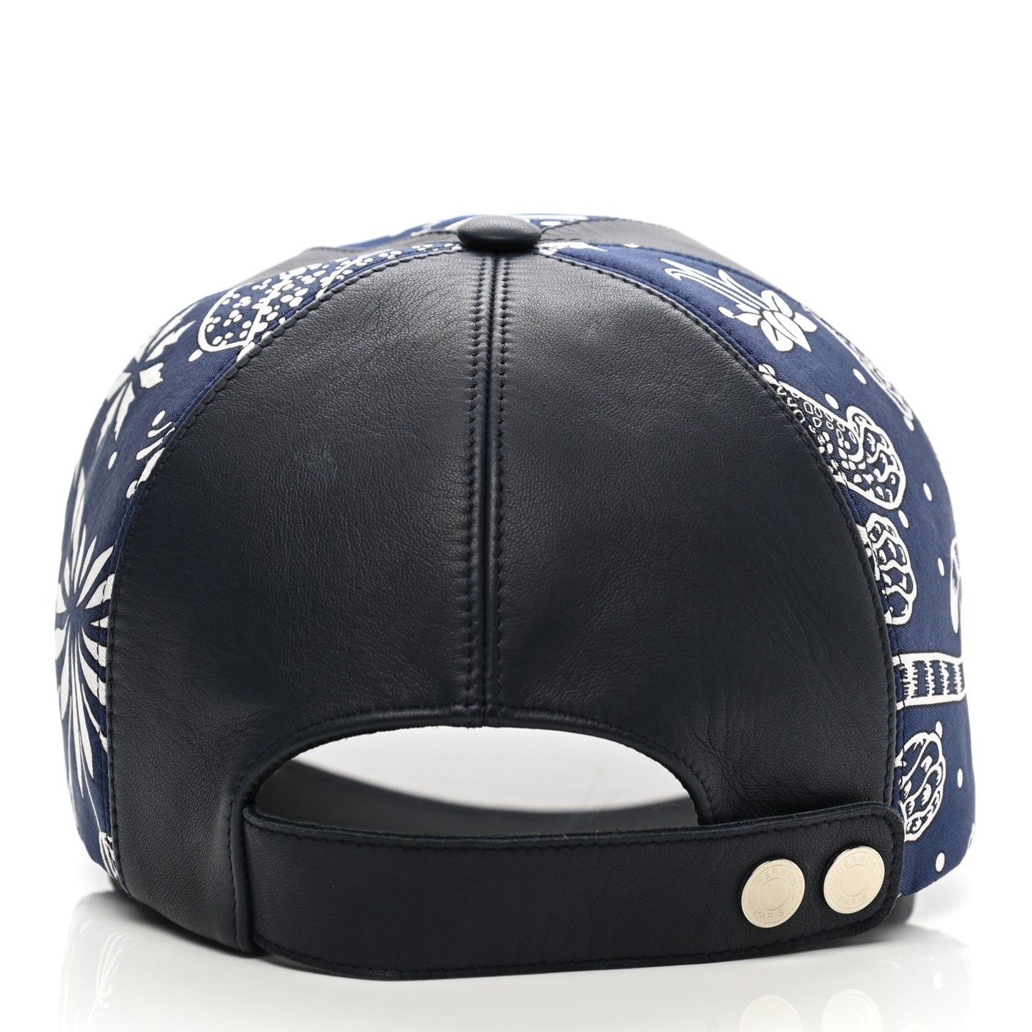 This is an authentic HERMES Lambskin Silk Thelma Les Leopards Bandana Hat size 59 in Marine and White. This chic hat is made of lambskin and silk with a bandana print in blue and white.