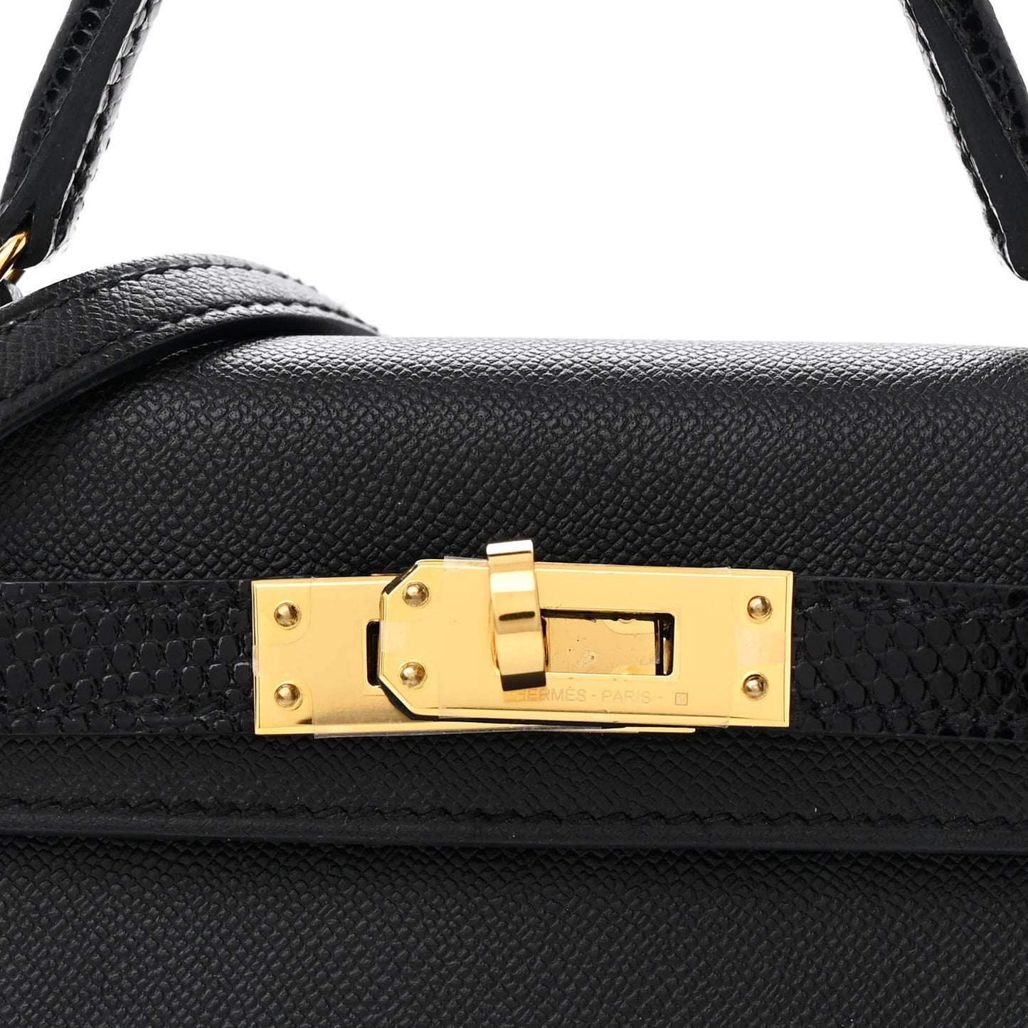 This is an authentic HERMES Madame Calfskin Lizard Mini Kelly Sellier Touch 20 in Black. This handbag is handcrafted of calfskin leather, and features a lizard leather top handle, an optional shoulder strap, frontal straps made of lizard leather with polished gold hardware. The top flap opens to a leather interior with a patch pockets.Follow this item for alerts. Hermes is a registered trademark of Hermes. FASHIONPHILE is not affiliated with Hermes.