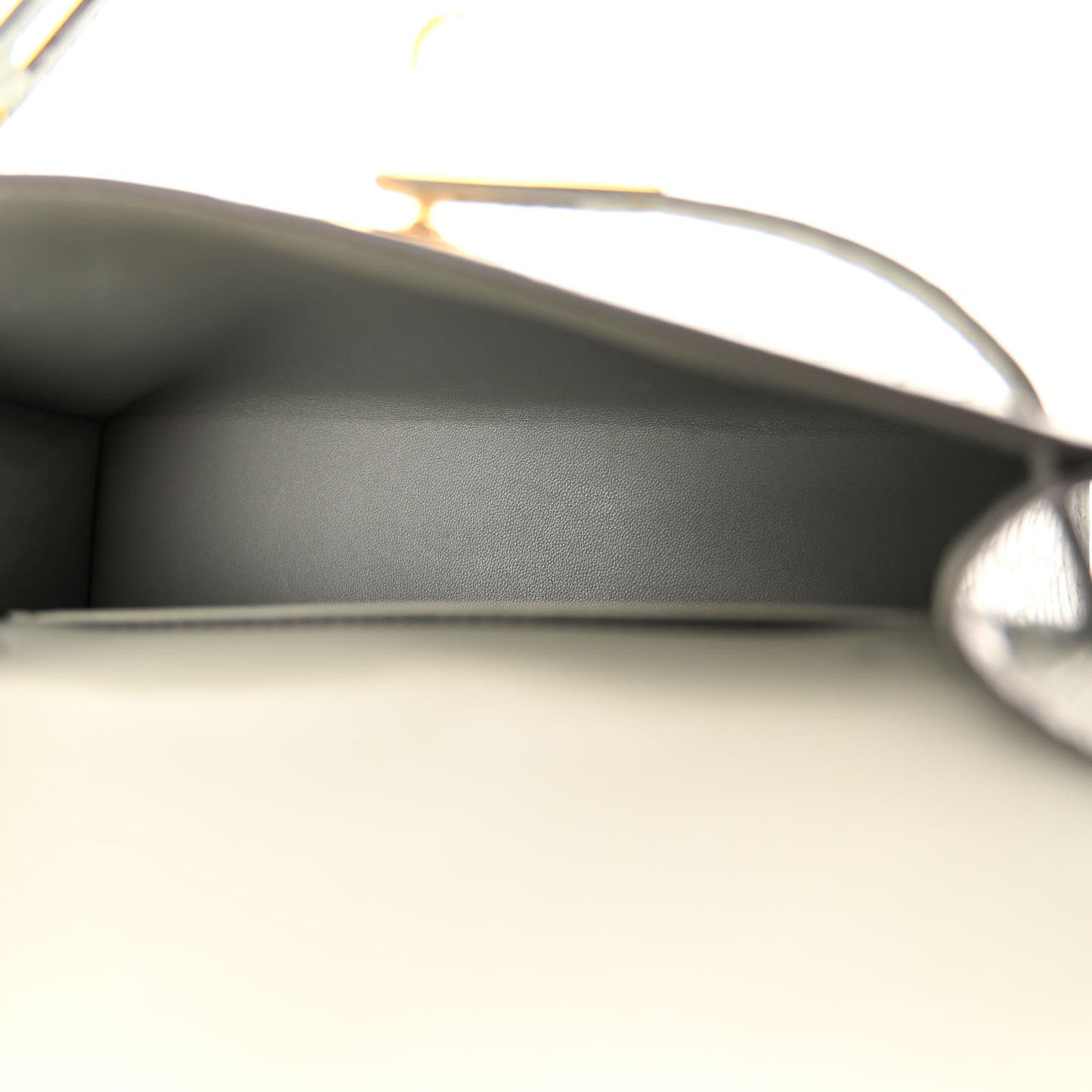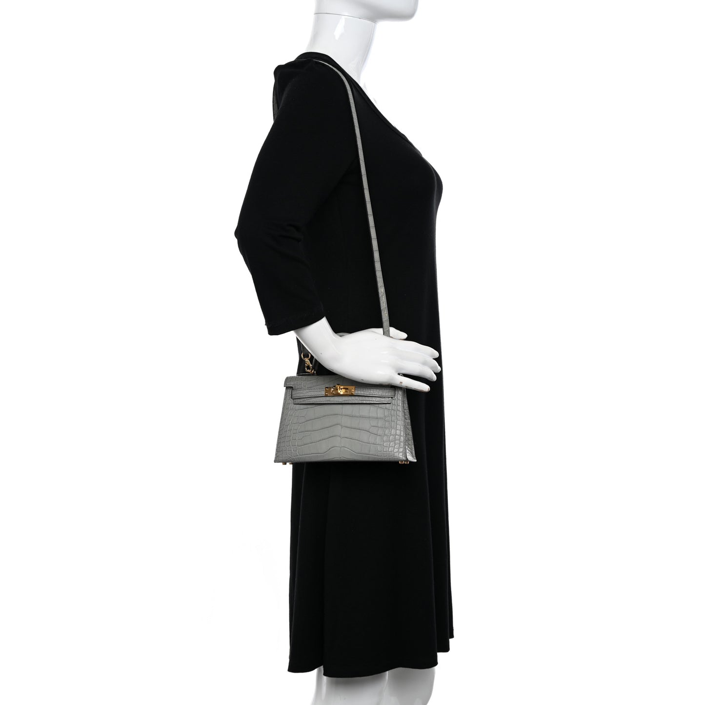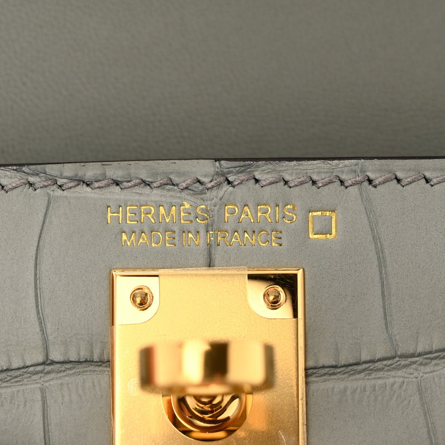 This authentic Hermes Matte Alligator Mini Kelly Sellier 20 in Gris Ciment. It features a single rolled leather top handle, a removable shoulder strap, and gold-plated hardware. The Kelly turn lock unlocks a grey chévre goatskin leather interior with a single flat pocket.Follow this item for alerts. Hermes is a registered trademark of Hermes. FASHIONPHILE is not affiliated with Hermes.
