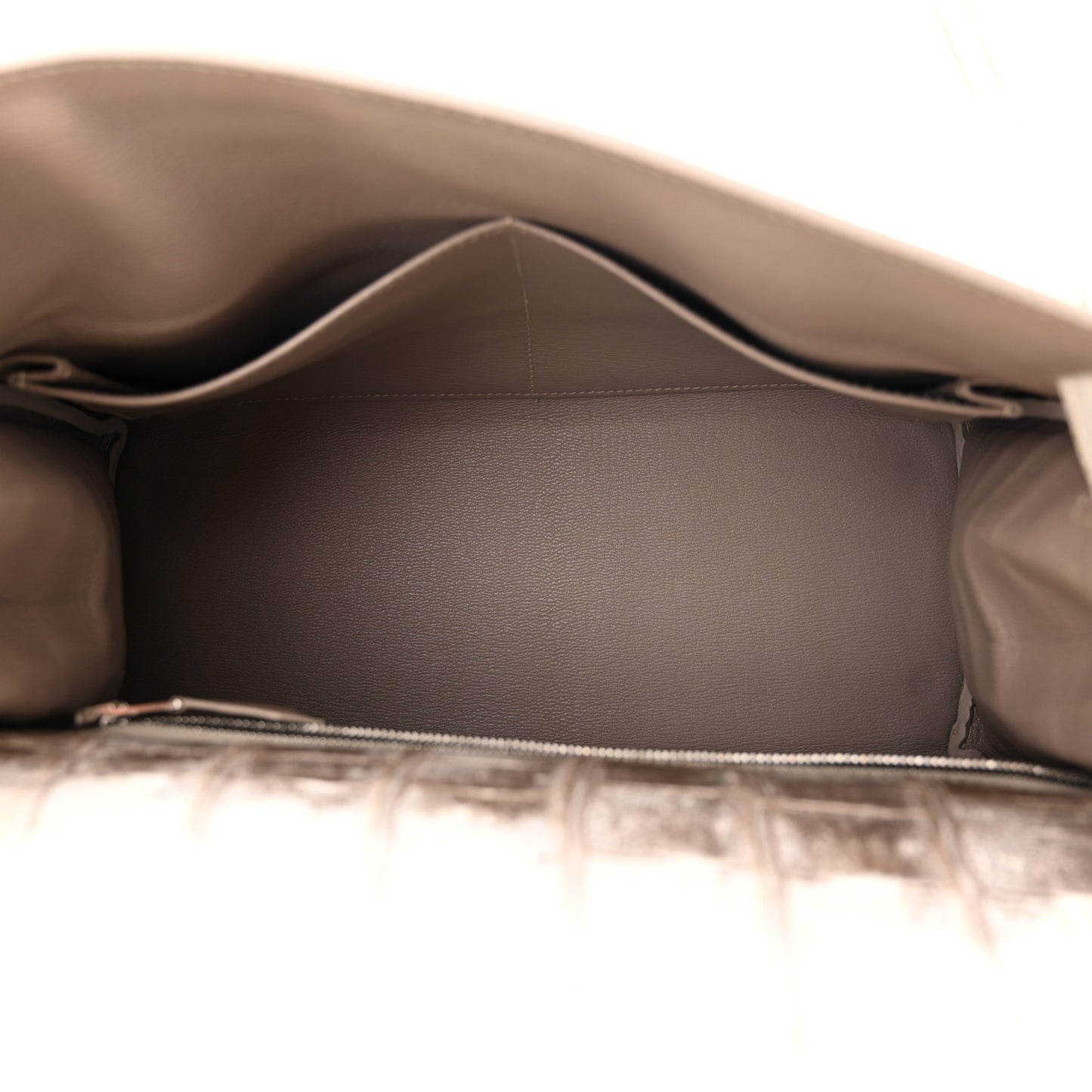 This authentic HERMES Matte Niloticus Crocodile Himalaya Kelly Retourne 28 in White. Equally iconic and elusive, the Himalaya Kelly is an exquisite piece of fashion art history. Created from a backdrop of freshwater niloticus crocodile skin, this rare Kelly bag has been expertly tanned and dyed to attain beautiful contrast shading. It features all matching top handle, shoulder strap, clochette for lock and keys. The bag opens with the strap and turn lock to a grey leather interior with a zipper pocket and patch pockets, Hand-sewn stitching has been applied by a technique passed down through the centuries to an expert Hermes craftsman. Palladium plated hardware with protective stickers intact is found at the straps as well as the base feet. Included are two keys and a crocodile-wrapped cadena lock. This mid-sized Kelly features a roomy interior lined in gray goatskin leather, and features both zippered and flat pockets. Additional items included are the protective rain jacket, dustbags and an Hermes storage box. Please contact our Client Services personnel to inquire about our white glove service, returns policy and other special terms that apply to this item.