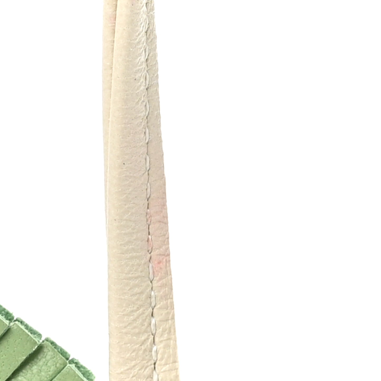 This is an authentic HERMES Milo Lambskin Grigri Rodeo Horse Bag Charm PM in Sesame, Vert Criquet, and Craie. This delightful bag charm is crafted in brown lambskin leather with a light green fringe and tail, and ivory saddle and leather strap.Follow this item for alerts. Hermes is a registered trademark of Hermes. FASHIONPHILE is not affiliated with Hermes.