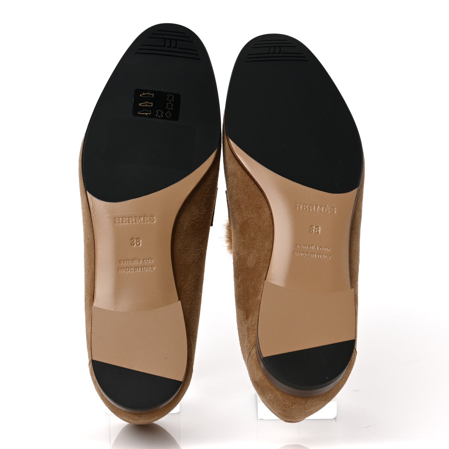 This is an authentic pair of HERMES Mink Fur Suede Goatskin Paris Loafers size 38 in Marron and Havane. These stylish loafers are crafted of light brown suede leather with mink fur at the toe with insoles of brown leather and stacked wooden heel. They feature a cross over strap with a large gold plated Hermes H.Follow this item for alerts. Hermes is a registered trademark of Hermes. FASHIONPHILE is not affiliated with Hermes.
