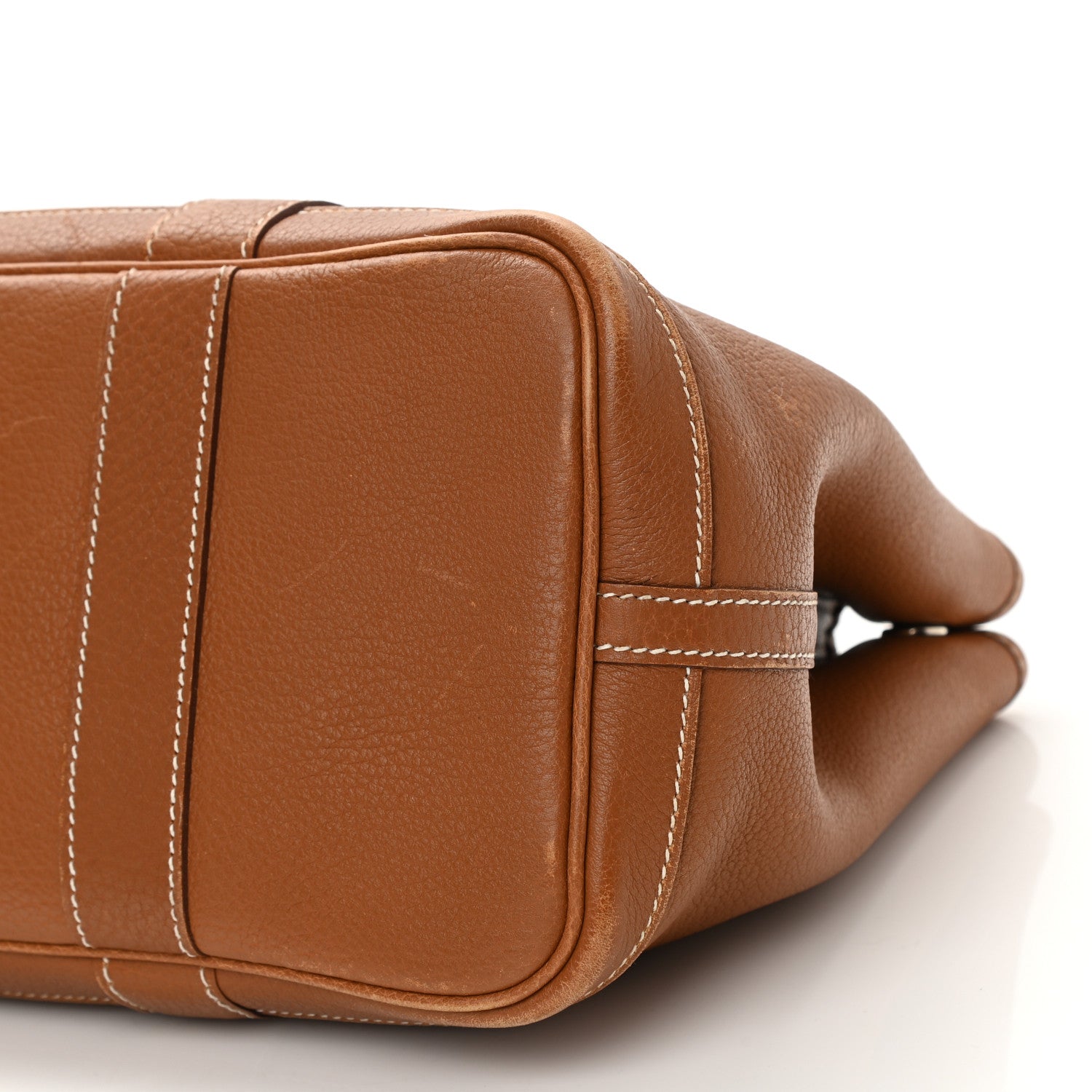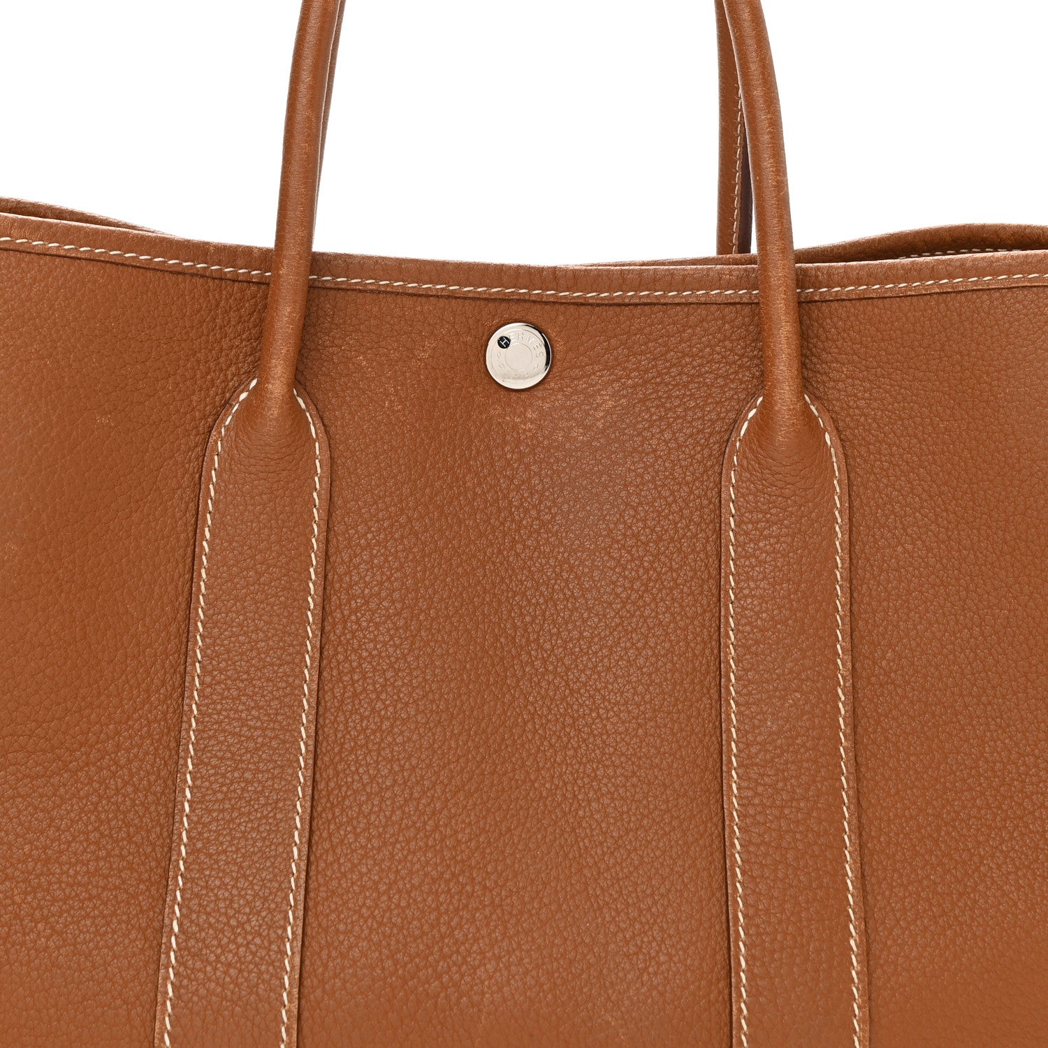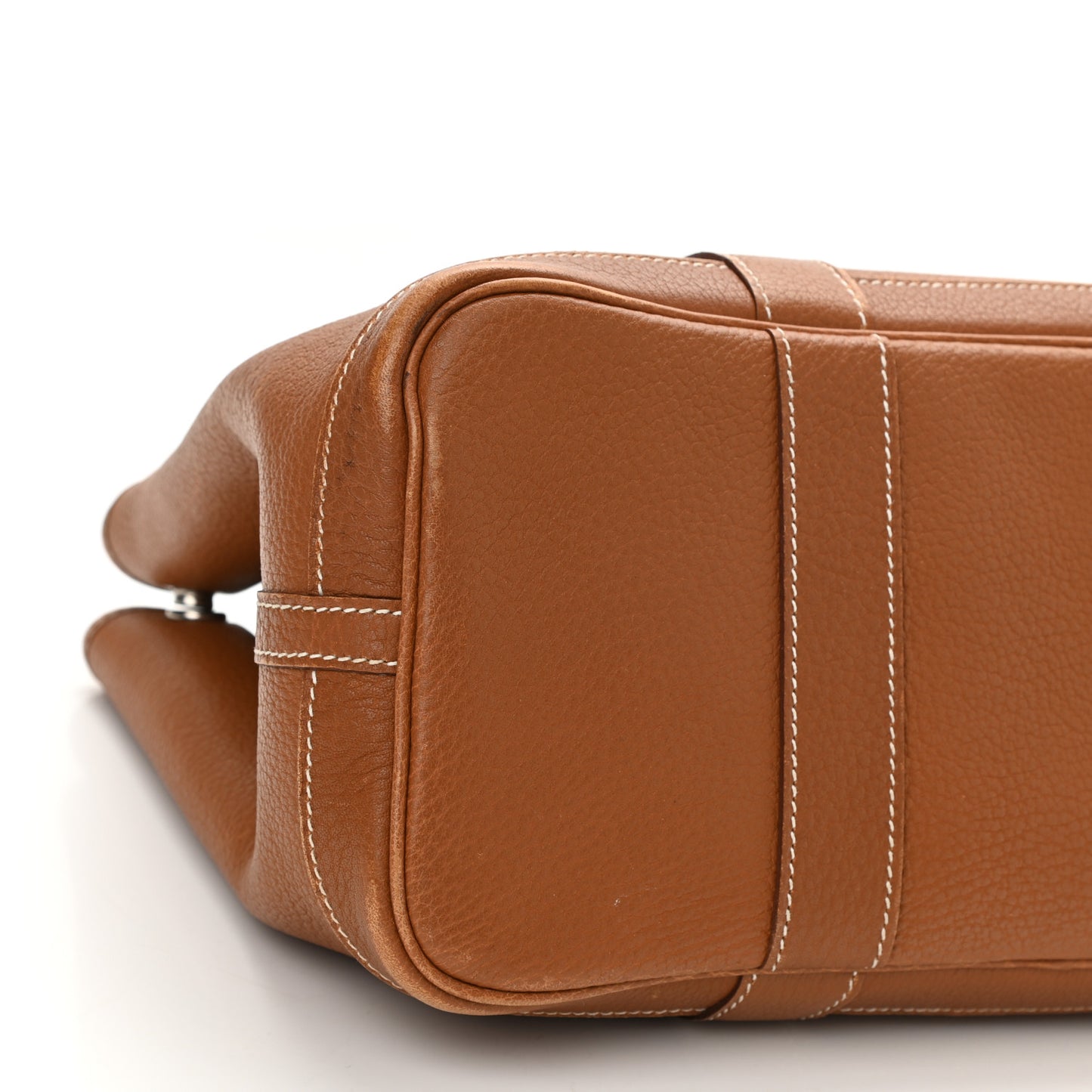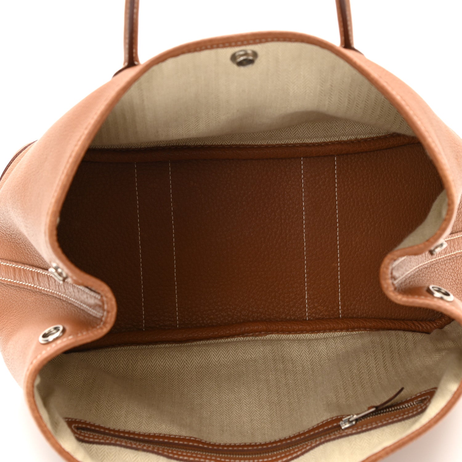 This is an authentic HERMES Negonda Garden Party 30 TPM in Gold. This sophisticated tote is finely crafted of grained luxurious leather in golden brown. This is a stunning handbag that features rolled top handles, expandable sides, and palladium silver hardware. The top is open to a herringbone fabric interior with a zipper pocket.