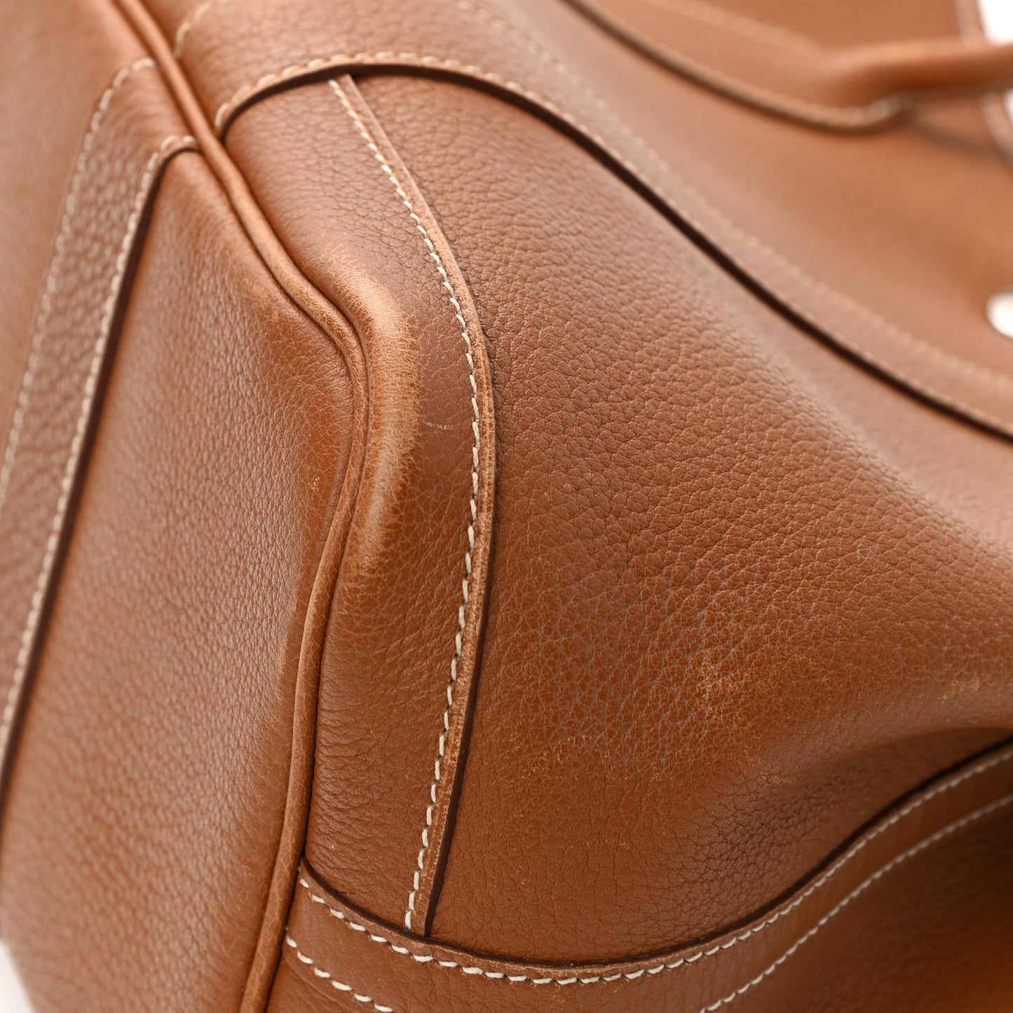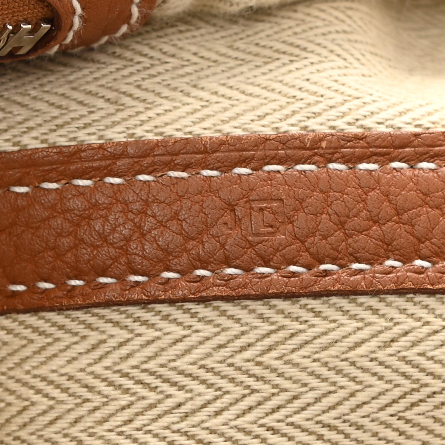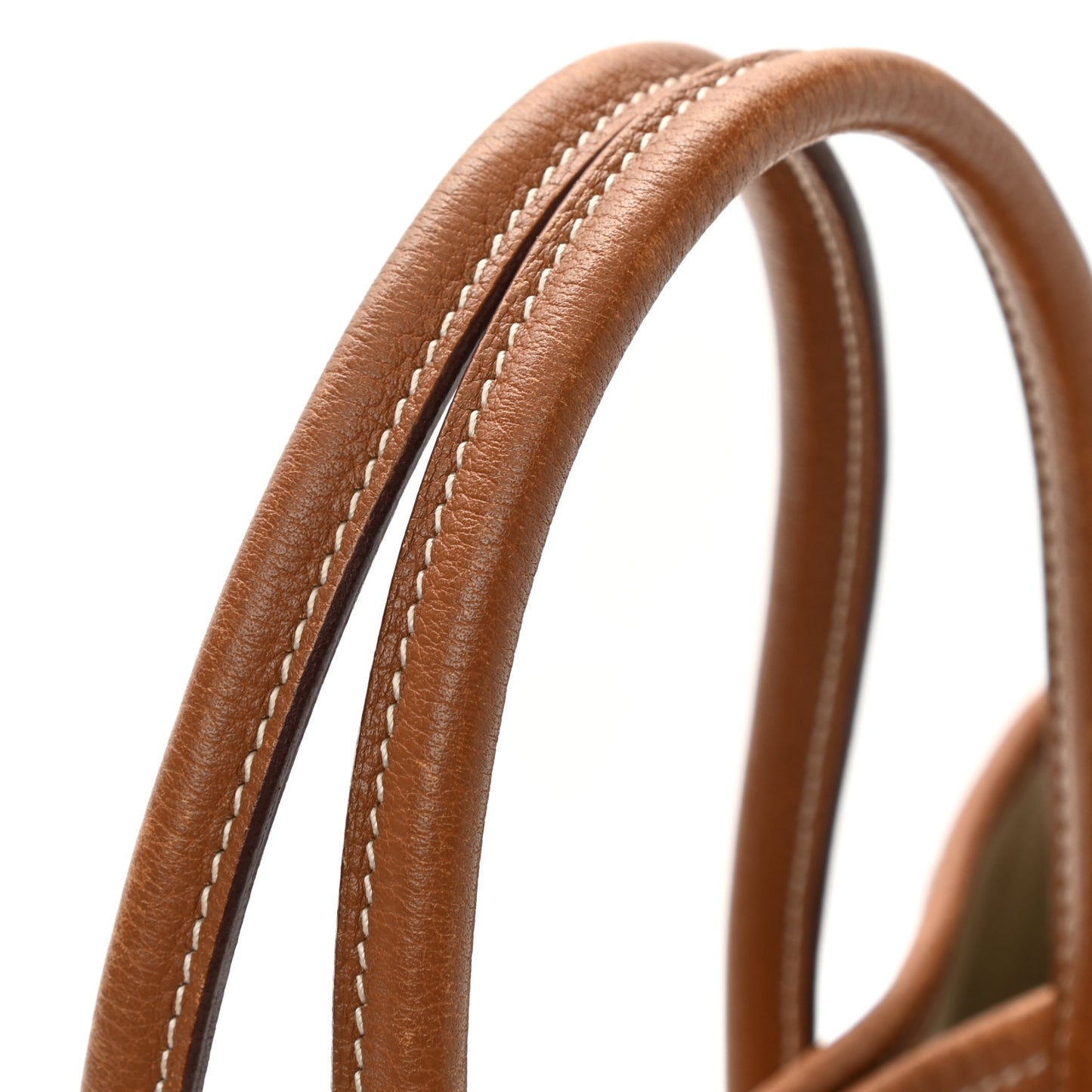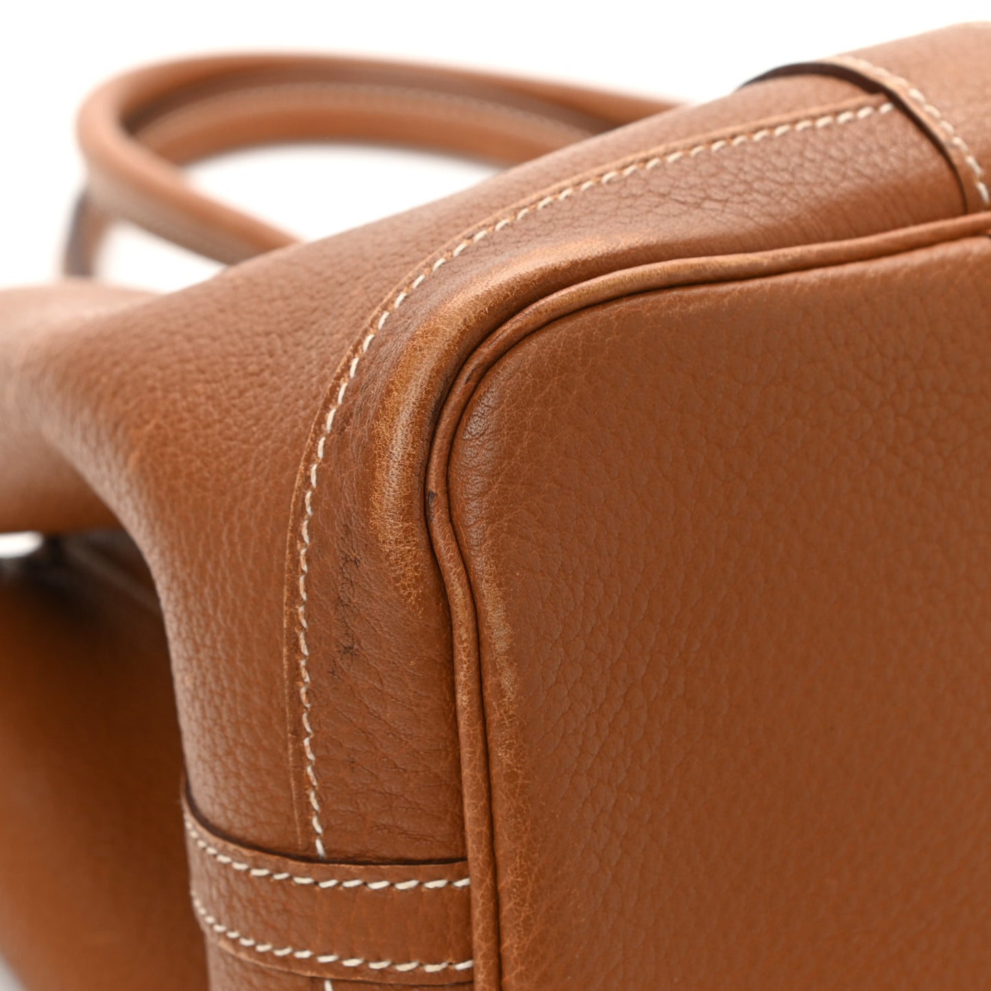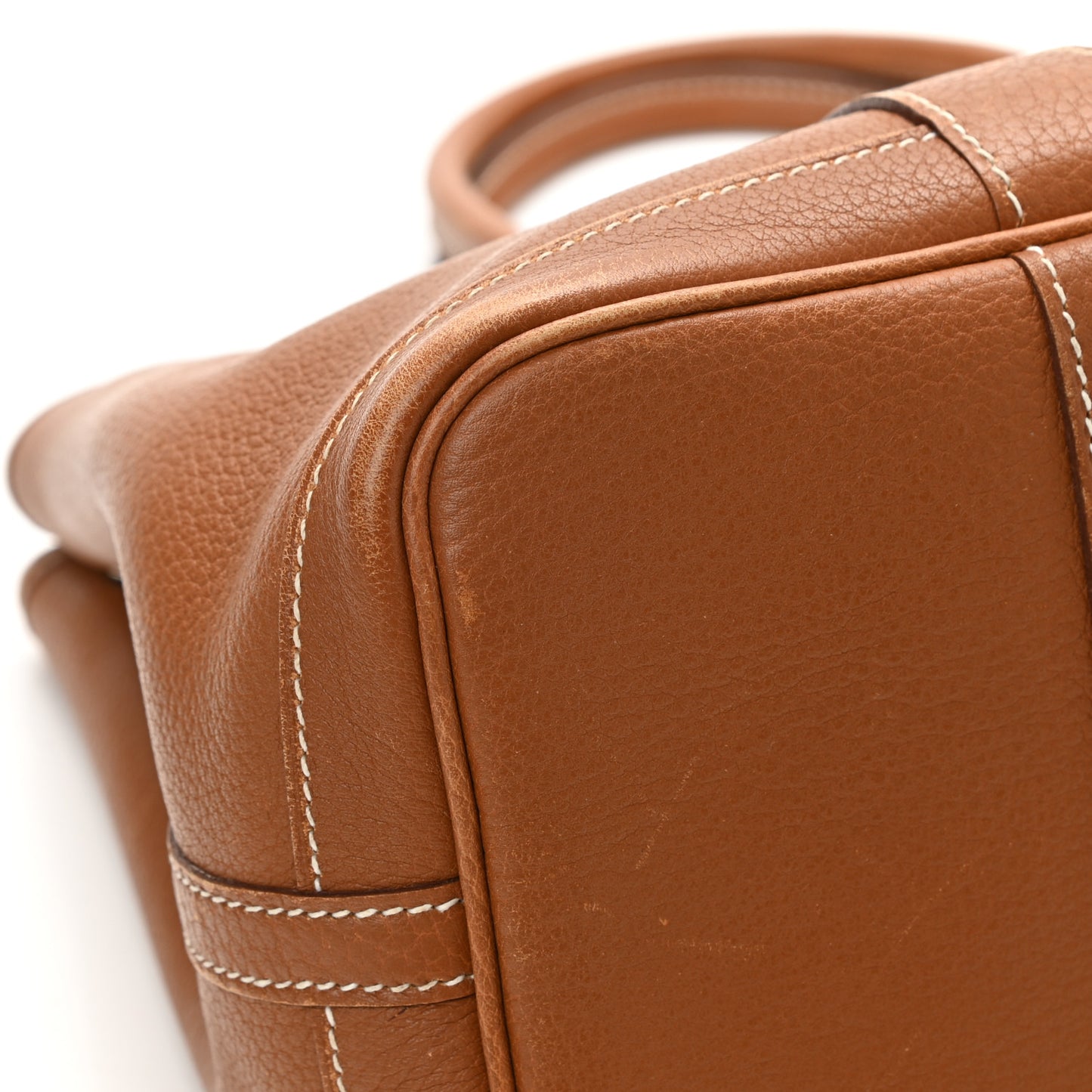 This is an authentic HERMES Negonda Garden Party 30 TPM in Gold. This sophisticated tote is finely crafted of grained luxurious leather in golden brown. This is a stunning handbag that features rolled top handles, expandable sides, and palladium silver hardware. The top is open to a herringbone fabric interior with a zipper pocket.