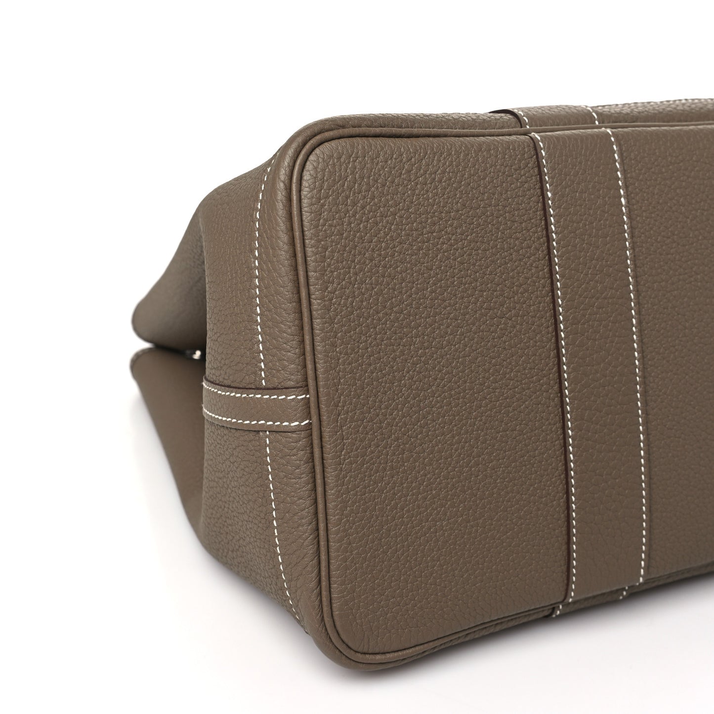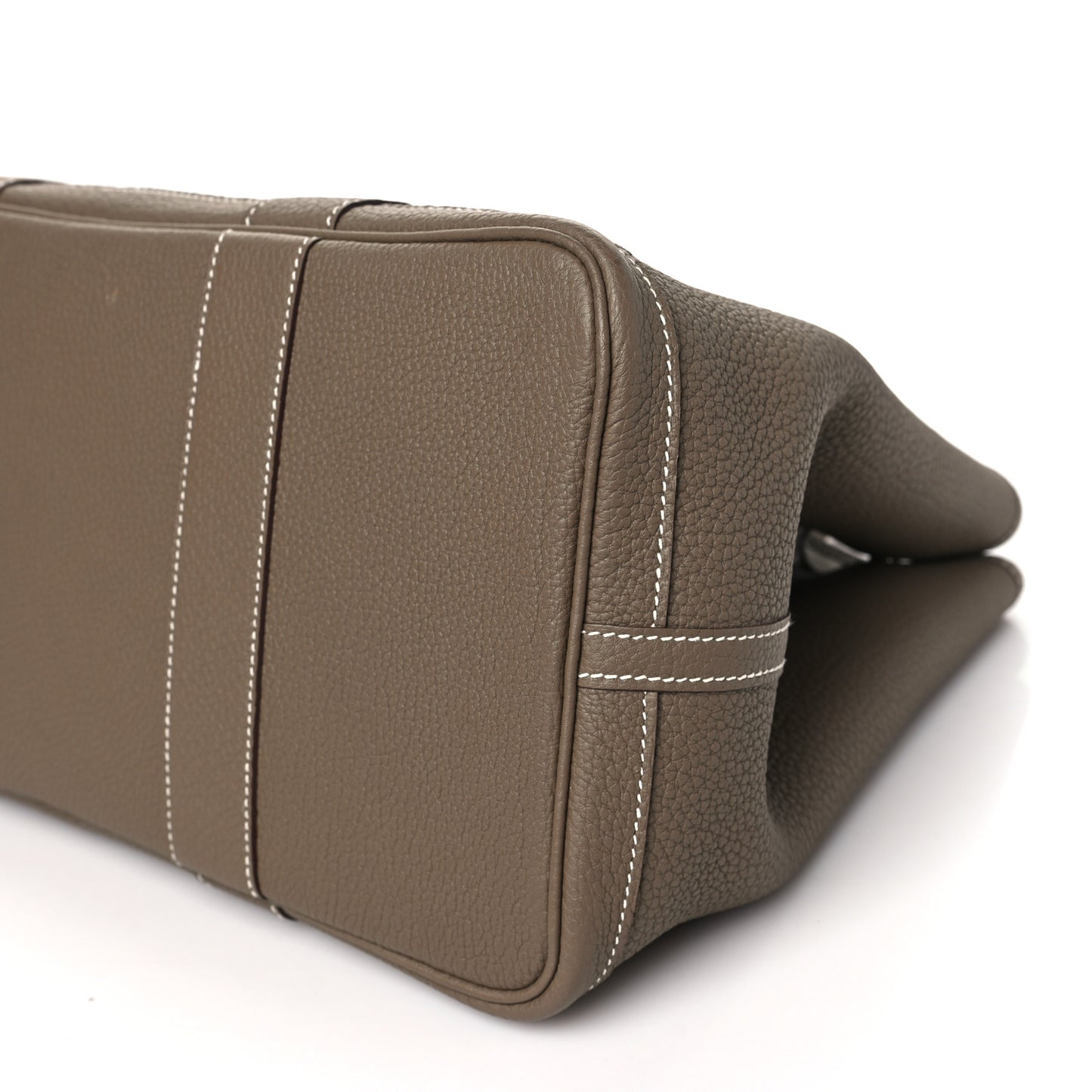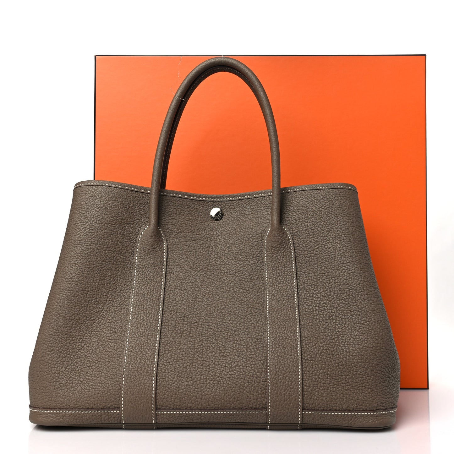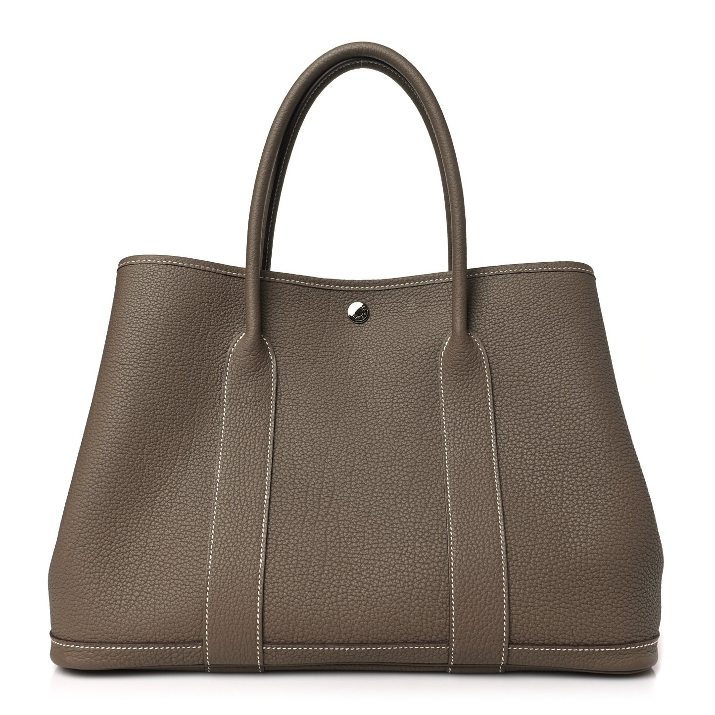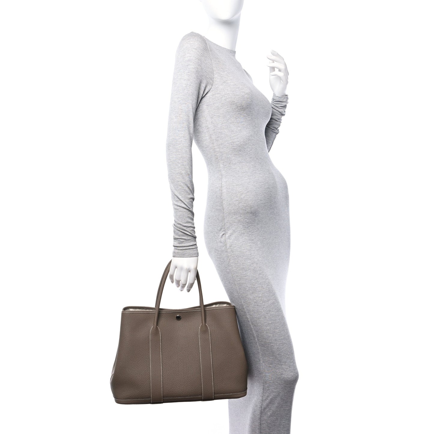 This is an authentic HERMES Negonda Garden Party 36 MM in Etoupe. This sophisticated tote is finely crafted of grained taupe leather with contrast stitching in white. The bag features expandable sides with a snap, facing trim that transitions into rolled leather top handles and a top snap in palladium silver that opens to a spacious ivory fabric interior with a zipper pocket.Follow this item for alerts. Hermes is a registered trademark of Hermes. FASHIONPHILE is not affiliated with Hermes.
