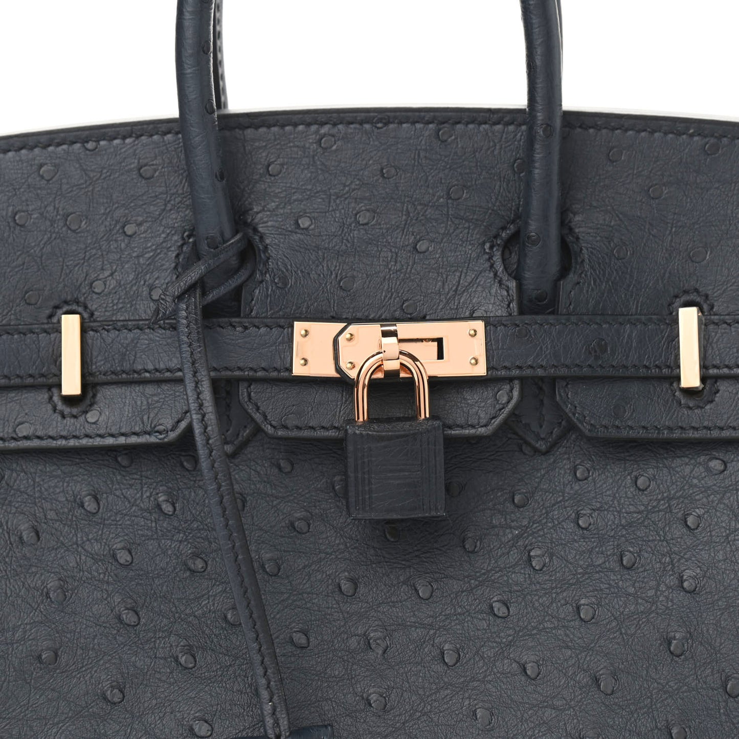 This is an authentic HERMES Ostrich Birkin 25 in Bleu Indigo. This handbag is expertly handcrafted of exotic ostrich leather in dark blue. The bag features rolled leather top handles, a frontal flap with a strap closure with rose gold plated hardware including a padlock and keys. The top flap opens to a matching chevre goatskin leather interior with zipper and patch pockets.Follow this item for alerts. Hermes is a registered trademark of Hermes. FASHIONPHILE is not affiliated with Hermes.