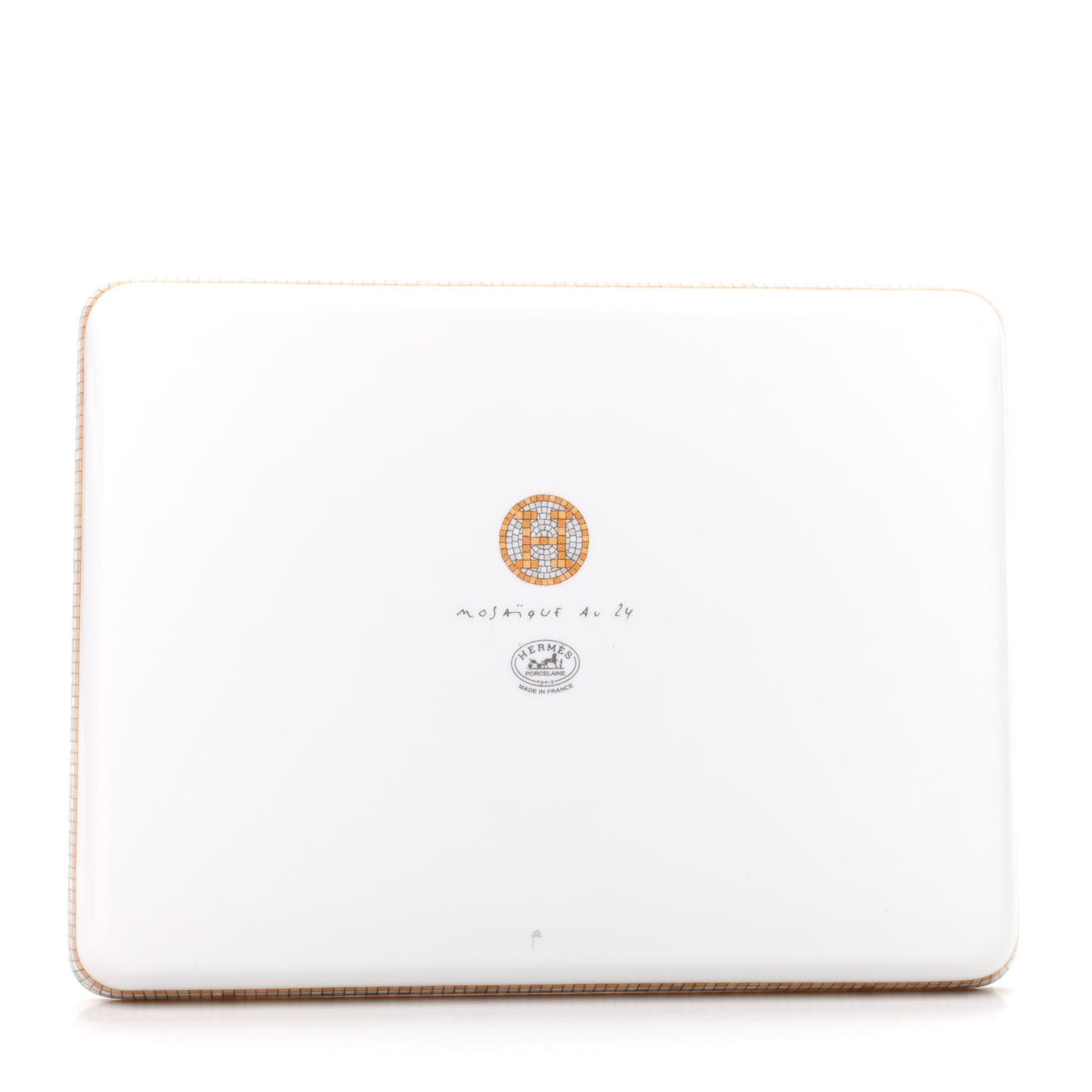 This is an authentic HERMES Porcelain Mosaique au 24 Sushi Plate. This classic porcelain plate is a work of magnificent artistry by Hermes in gold and antique white porcelain. It features a bold mosaic design with a central Hermes logo.Follow this item for alerts. Hermes is a registered trademark of Hermes. FASHIONPHILE is not affiliated with Hermes.