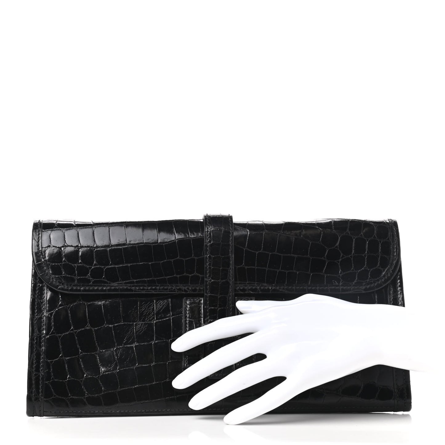 This is an authentic HERMES Shiny Niloticus Crocodile Jige Elan 29 Clutch in Black. This stylish clutch is crafted of luxurious shiny crocodile leather in black. There is a cross-over flap and a strap that tucks under a leather Hermes "H." This opens to a smooth black leather interior.Follow this item for alerts. Hermes is a registered trademark of Hermes. FASHIONPHILE is not affiliated with Hermes.