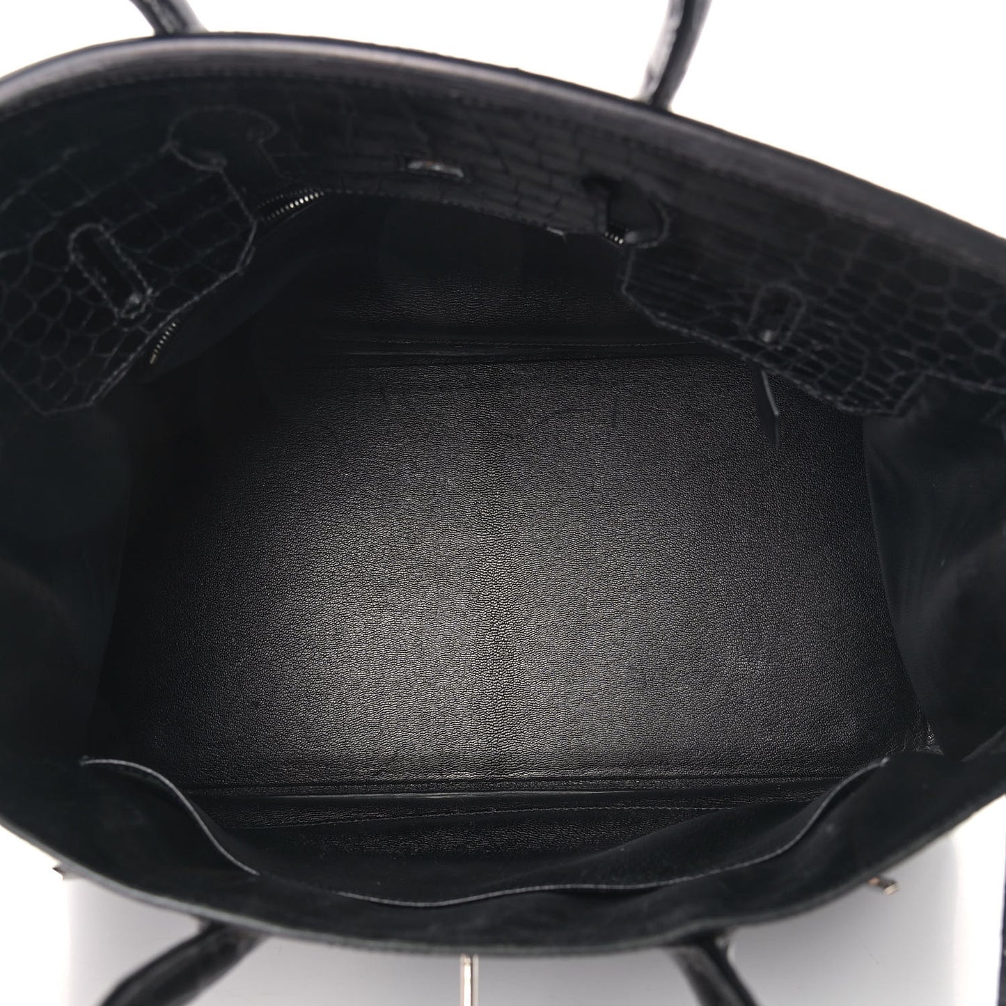 This is the authentic HERMES Shiny Porosus Crocodile Birkin 35 in Black. This stunning handbag is featured in luxurious black crocodile including the padlock and matching clochette. The top flap opens to an interior of chevre goatskin leather with zipper and patch pockets.Follow this item for alerts. Hermes is a registered trademark of Hermes. FASHIONPHILE is not affiliated with Hermes.
