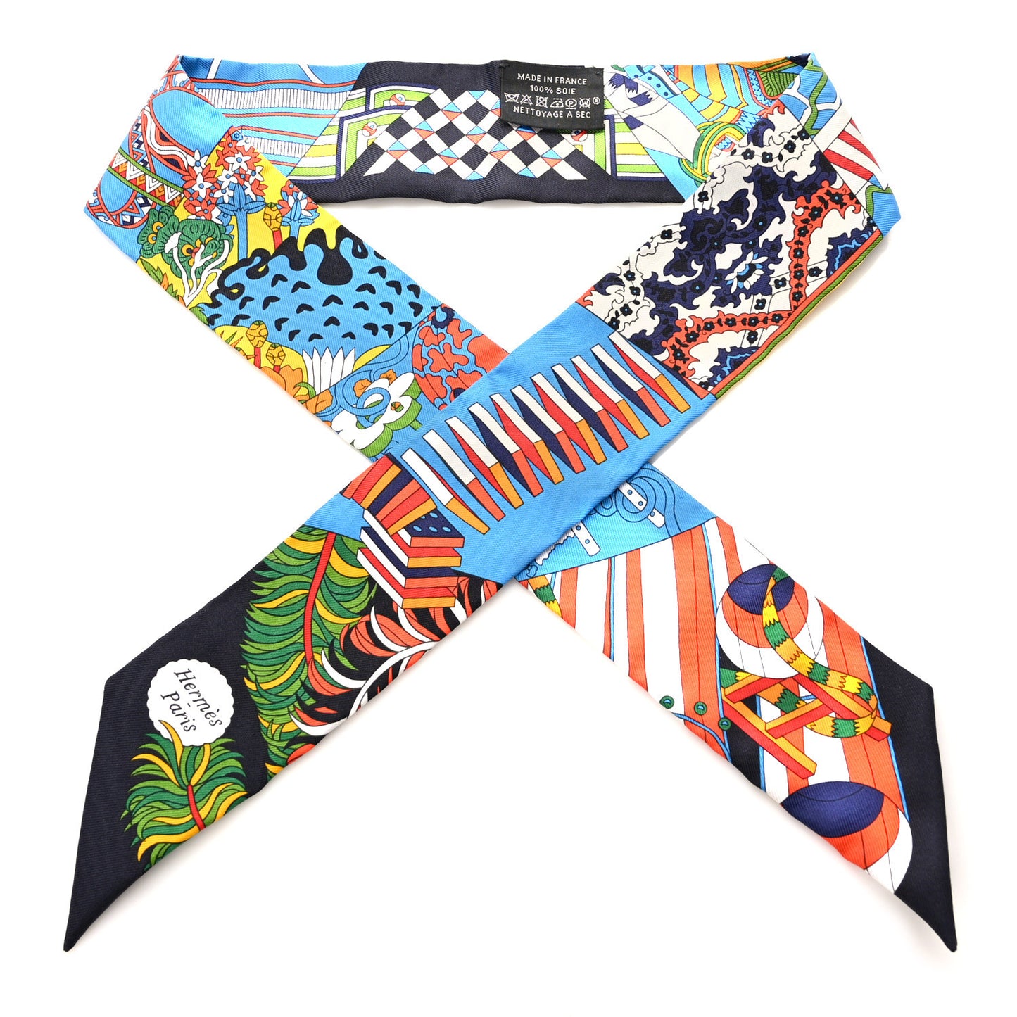 This is an authentic HERMES Silk De l'Ombrelle Aux Duels Twilly in Black, Bleu and Jaune Vif. This beautiful 100% silk scarf features a multicolor design.Follow this item for alerts. Hermes is a registered trademark of Hermes. FASHIONPHILE is not affiliated with Hermes.