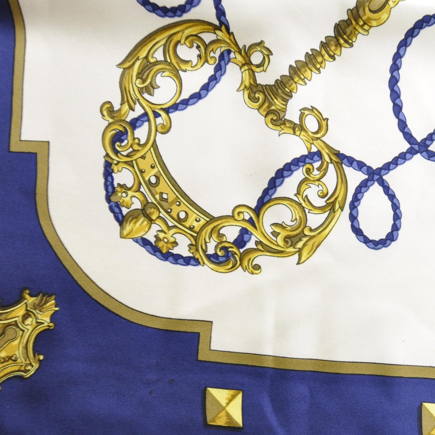 This is an authentic HERMES Silk Keys Les Cles Scarf 90 in Blue. This is a sophisticated silk Hermes square scarf that features a circular arrangement of antique keys, each one different from the next on a white ground with royal blue and gold. Each of the designs are fascinating and it is an original and attractive scarf to be worn in any number of ways, from Hermes!Follow this item for alerts. Hermes is a registered trademark of Hermes. FASHIONPHILE is not affiliated with Hermes.