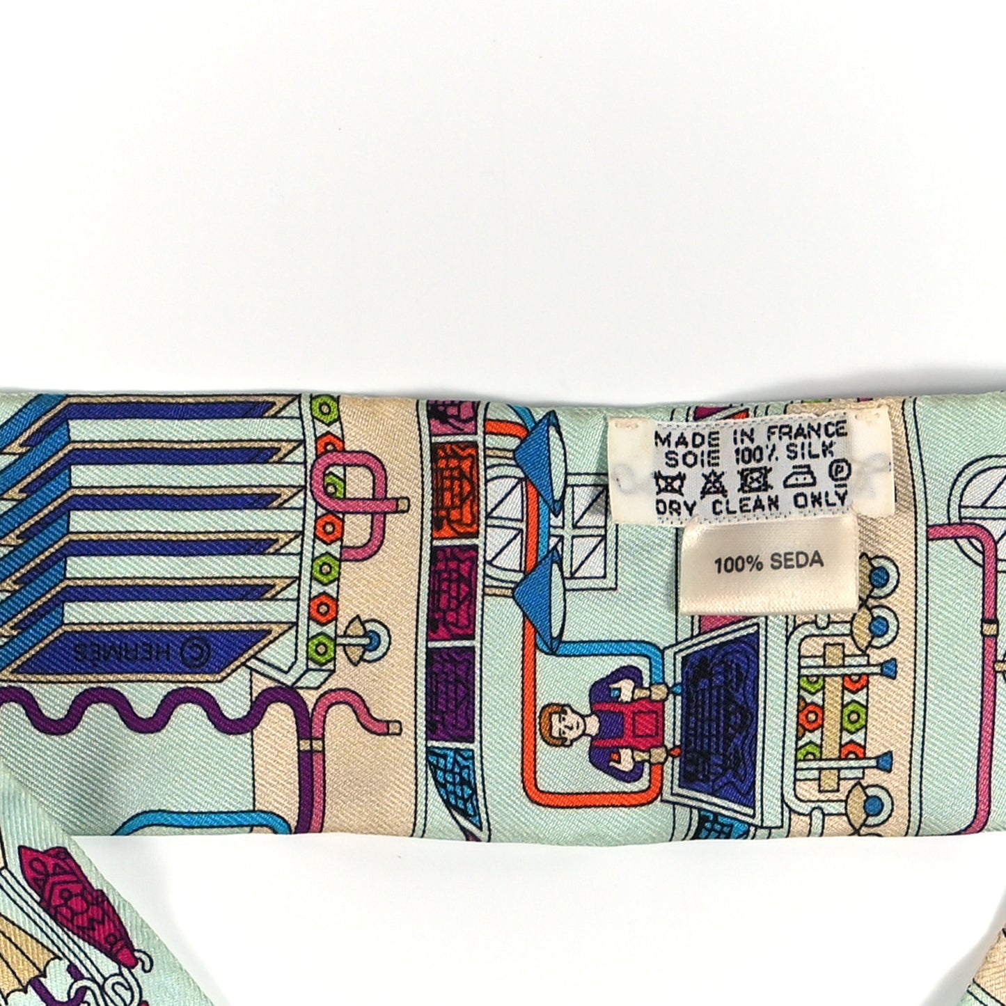 This is an authentic HERMES Silk La Maison des Carres Twilly in Aqua, Vert D'eau, and Rose. This bold scarf is 100% silk and features people in a factory setting on a pastel green background at the iconic Hermes silk scarf factory.Follow this item for alerts. Hermes is a registered trademark of Hermes. FASHIONPHILE is not affiliated with Hermes.