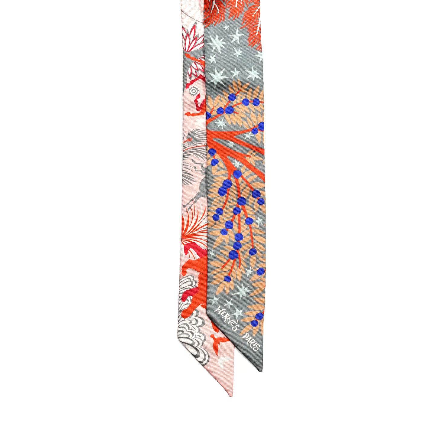This is an authentic HERMES Silk Le Charme D Orphee Twilly in Gris Acier and Rose Poudre. This is a charming narrow 100% silk twilly scarf and features a wild animals and trees on a light pink and gray background.Follow this item for alerts. Hermes is a registered trademark of Hermes. FASHIONPHILE is not affiliated with Hermes.