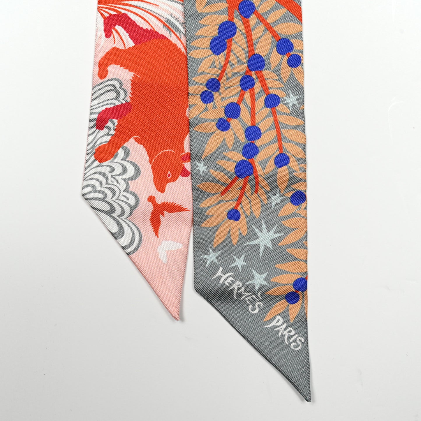 This is an authentic HERMES Silk Le Charme D Orphee Twilly in Gris Acier and Rose Poudre. This is a charming narrow 100% silk twilly scarf and features wild animals and trees on a light pink and gray background.Follow this item for alerts. Hermes is a registered trademark of Hermes. FASHIONPHILE is not affiliated with Hermes.