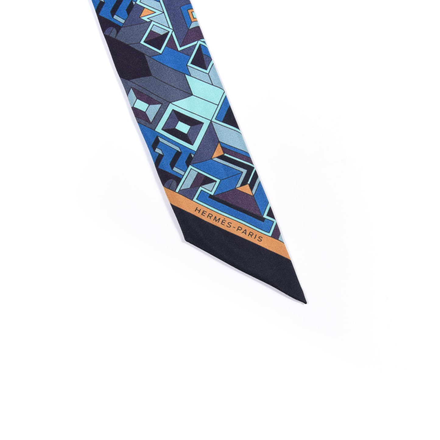 This is an authentic Hermes Silk Le Fil d'Ariane Twilly. The bold design and exceptional quality of this 100% silk Hermes twilly makes it a fabulous fashion accessory. This slim scarf features a graphic design in shades of blue.Follow this item for alerts. Hermes is a registered trademark of Hermes. FASHIONPHILE is not affiliated with Hermes.