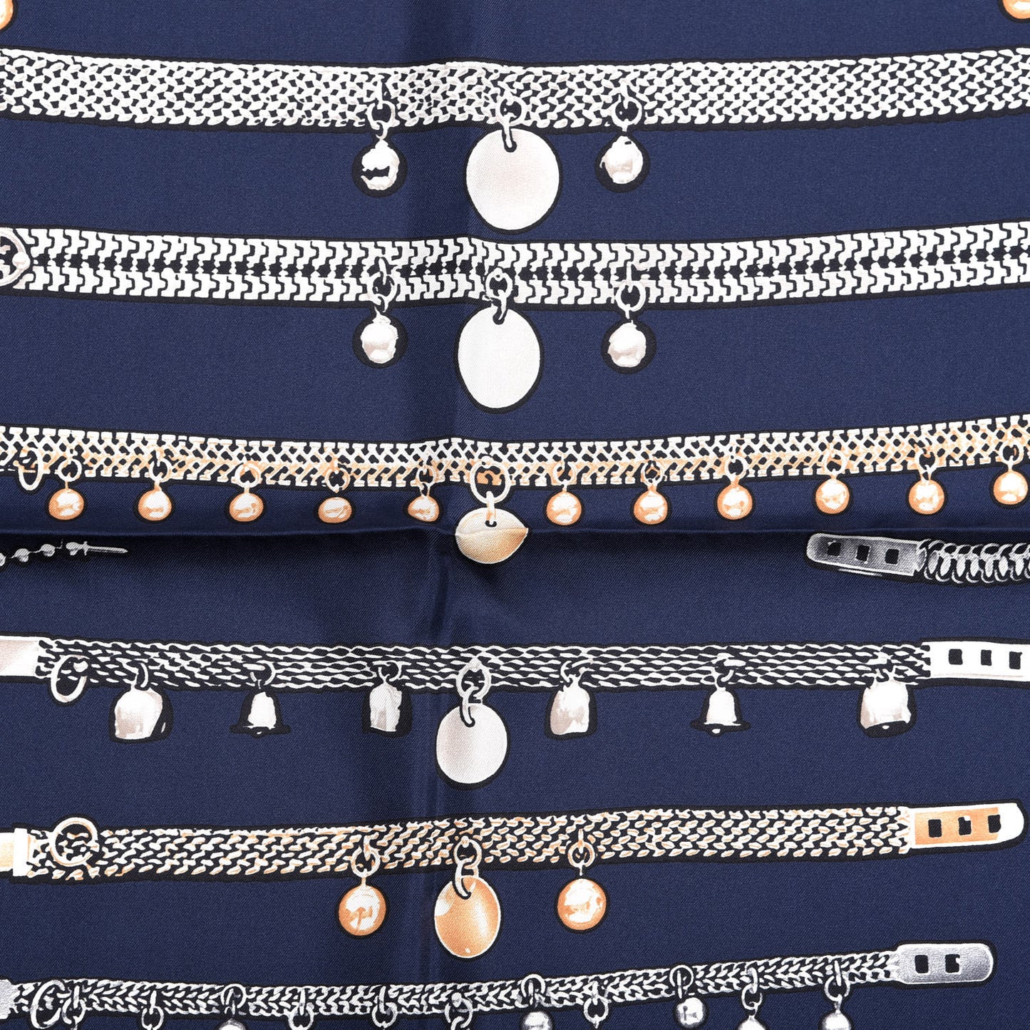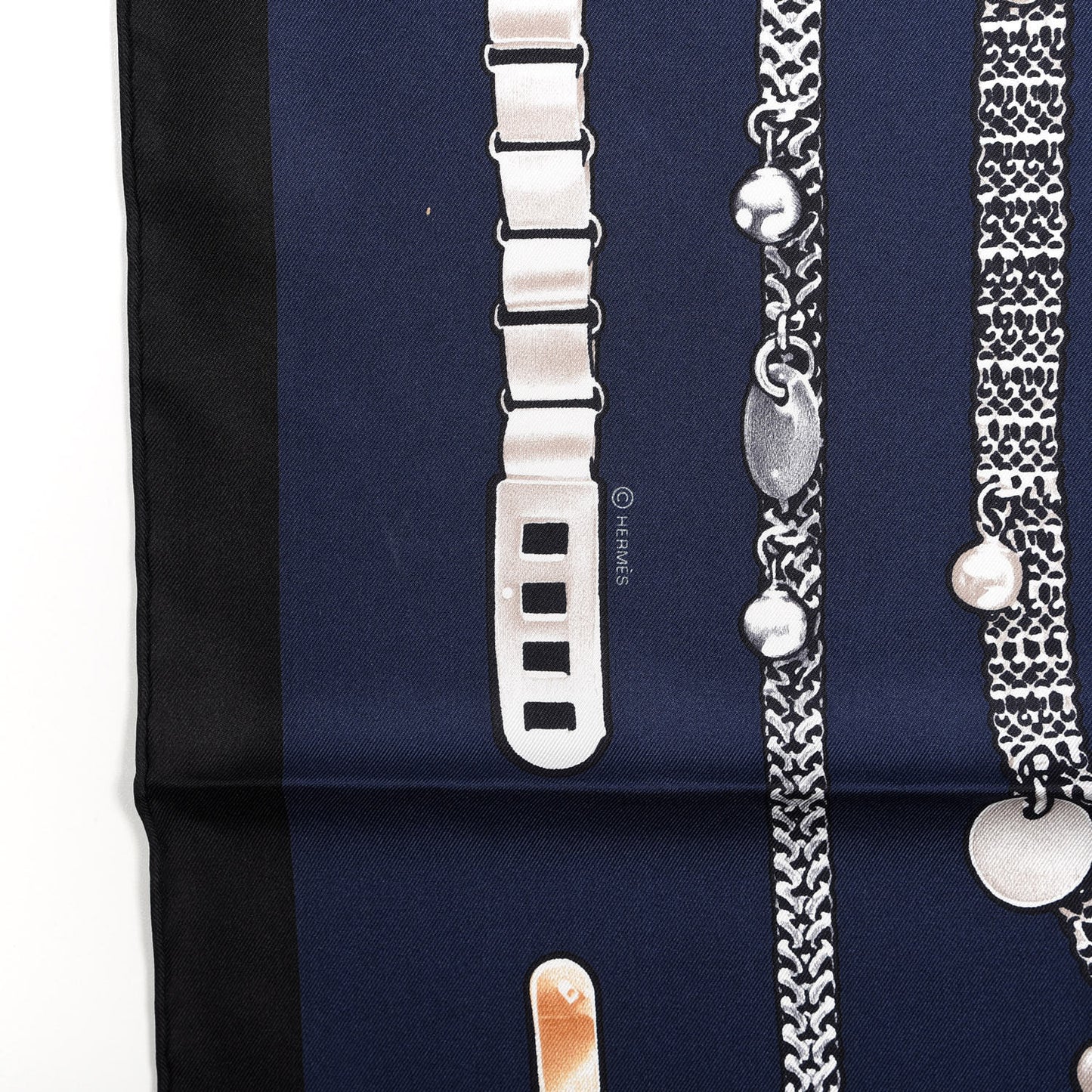 This is an authentic HERMES Silk Le Tresor De Medor Scarf 90 in Black, Bleu Marine, and Gris. The scarf is 100% silk and features a decorative design featuring illustrations of dog collars on a dark blue background with a black border.Follow this item for alerts. Hermes is a registered trademark of Hermes. FASHIONPHILE is not affiliated with Hermes.