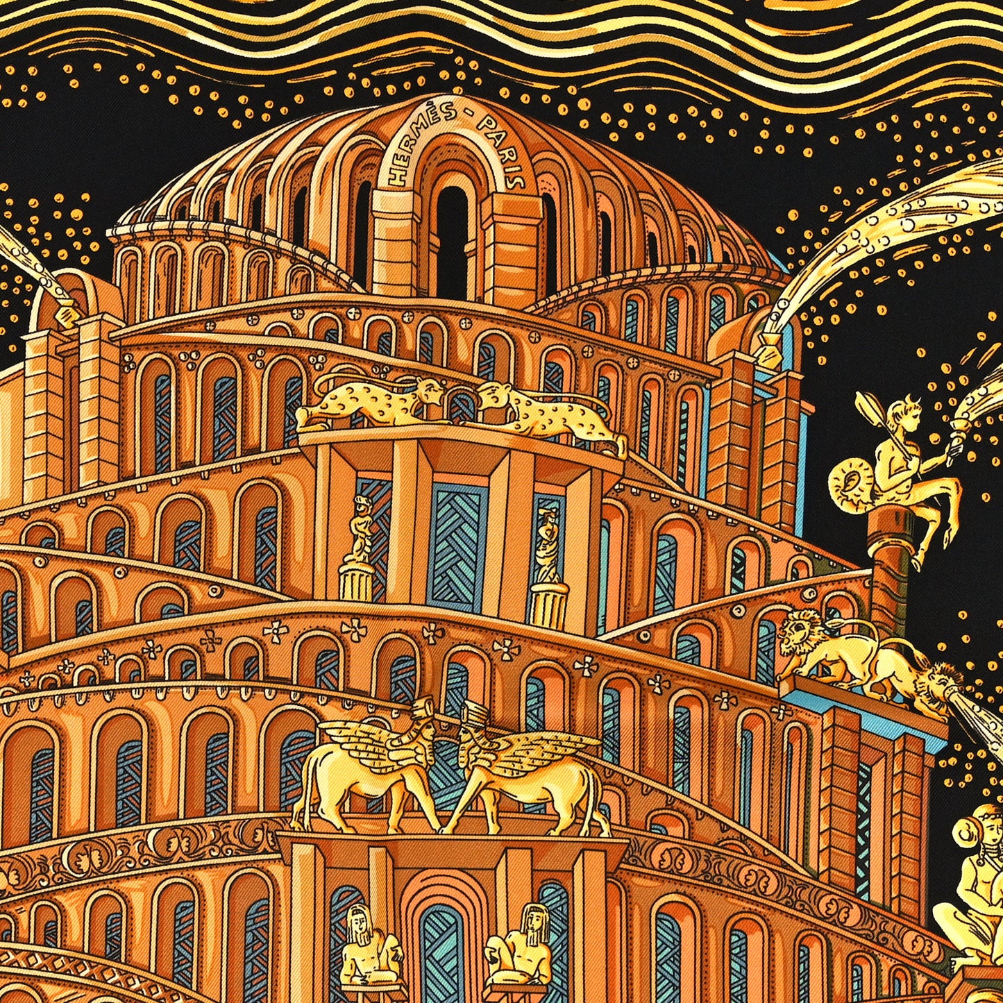 This is an authentic HERMES Silk Les Rivieres de Babel Scarf 90. This 100% silk scarf features an ornamental Tower of Babel scene in black and gold.Follow this item for alerts. Hermes is a registered trademark of Hermes. FASHIONPHILE is not affiliated with Hermes.