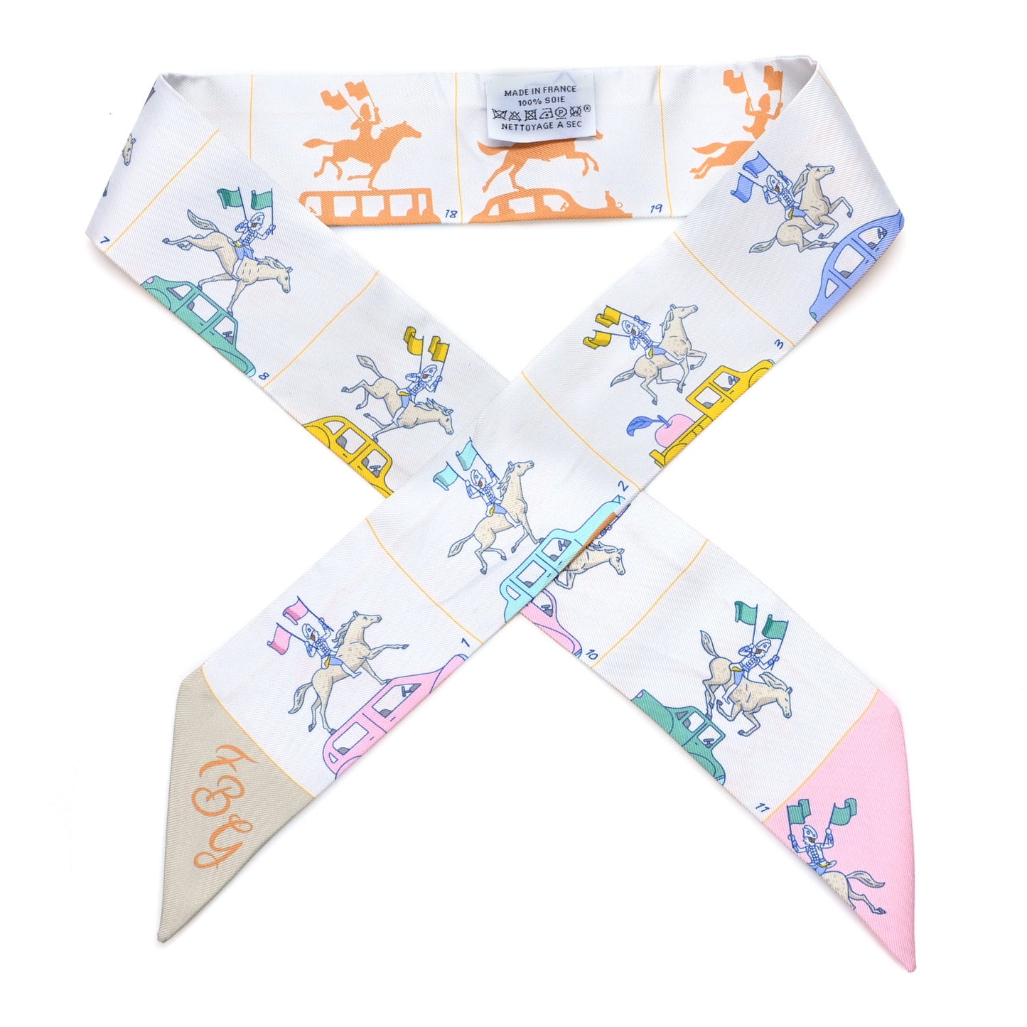This is an authentic HERMES Silk Parade CG Twilly in Gris Perle and Vert Jaune. This bold scarf is 100% silk and features a graphic multicolor design of horses on a white background.