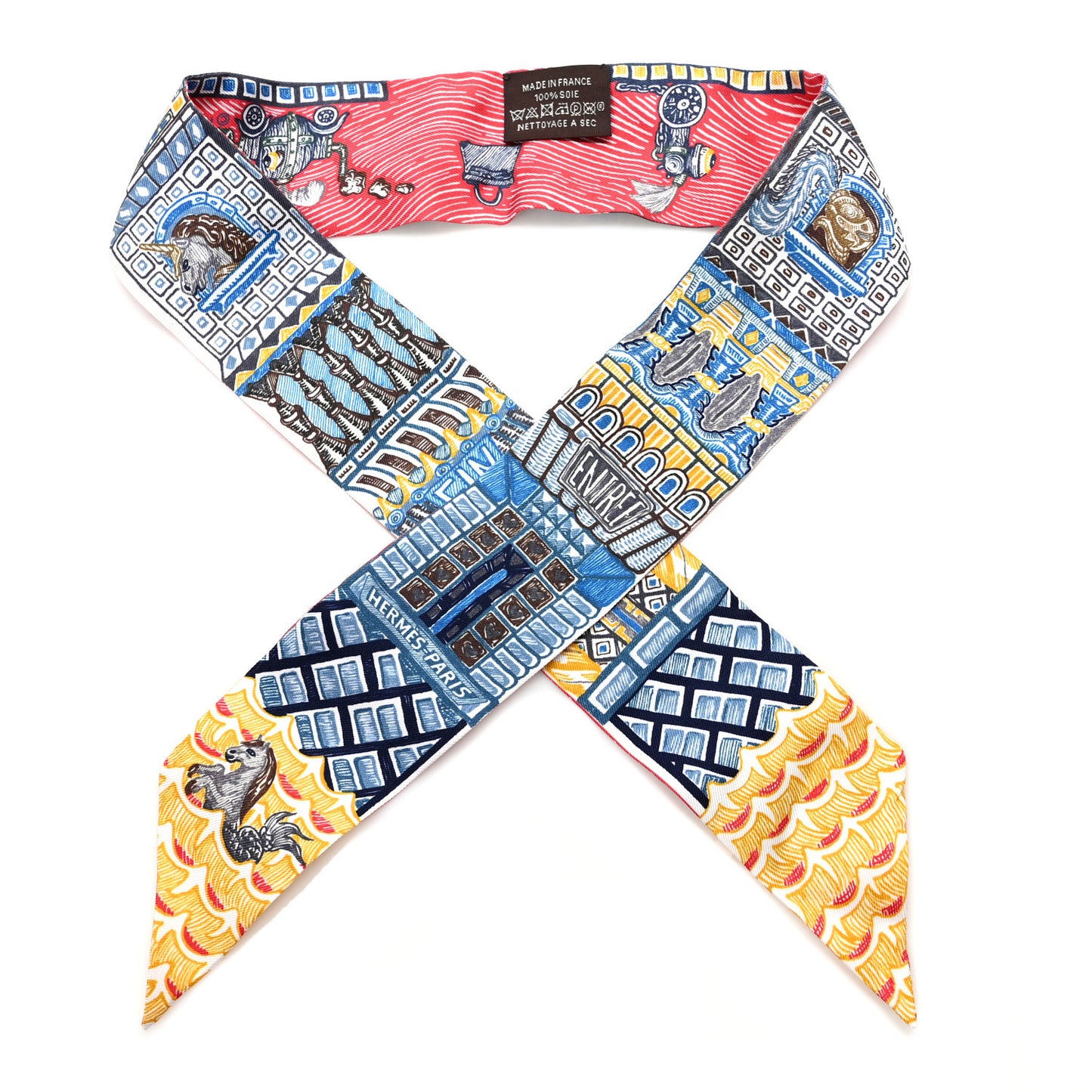 This is an authentic HERMES Silk Super Silk Quest Twilly in Bleu, Beige Dore and Brun. This is a charming narrow 100% silk twilly scarf and features a colorful design.