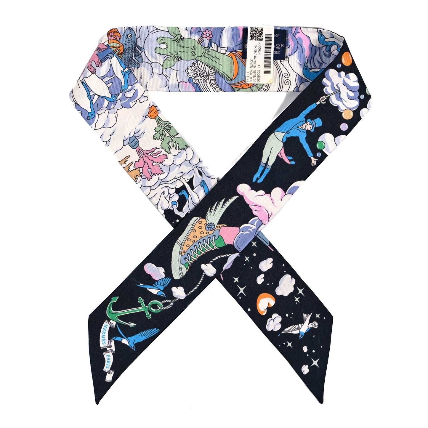 This is an authentic HERMES Silk Sur Mon Nuage Twilly in Bleu, Black and Mauve. This 100% silk is a charming narrow silk twill scarf that features a multicolored intricate design on a black background.Follow this item for alerts. Hermes is a registered trademark of Hermes. FASHIONPHILE is not affiliated with Hermes.