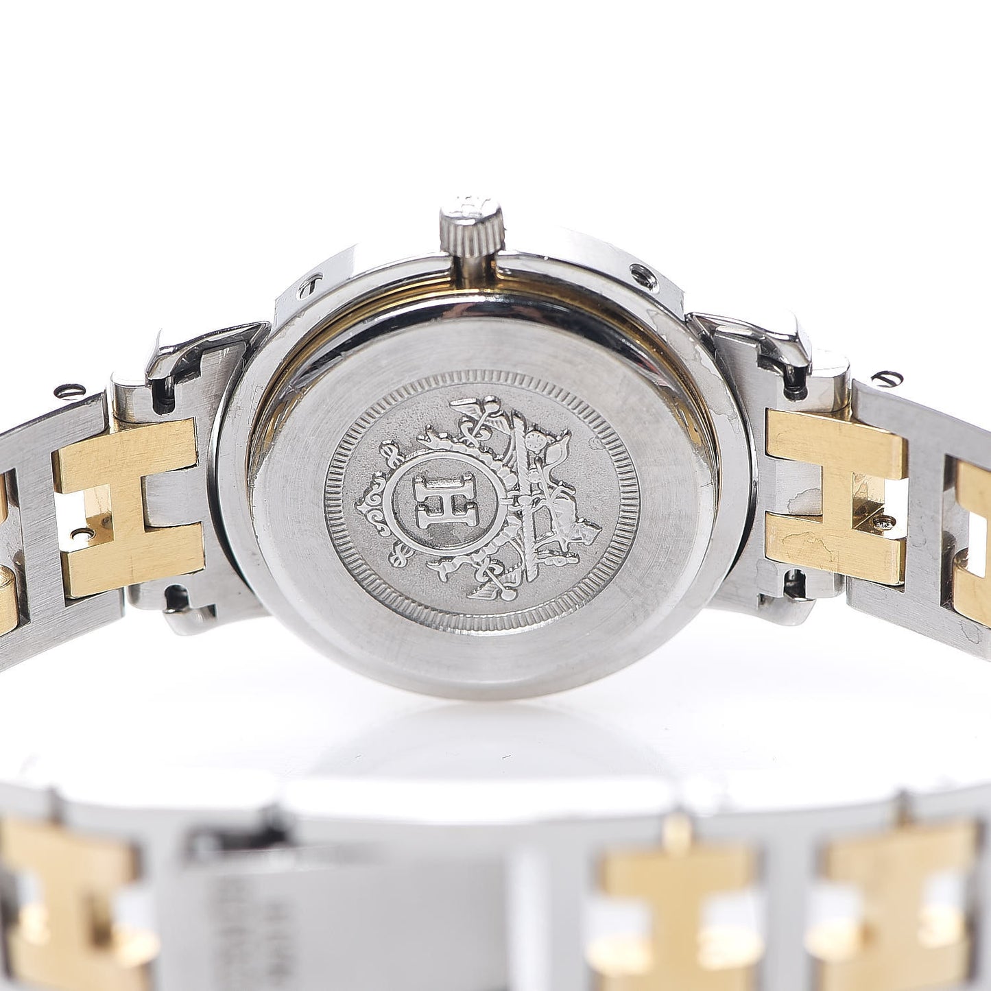 This is an authentic HERMES Stainless Steel 24mm Clipper Quartz Watch in Gold. This classic watch is crafted of stainless steel and features gold accents along the bezel, band, and sword hands. Features also include a beige colored dial, a date display, and Swiss quartz movement. This is a stylish watch with classic sophistication only from Hermes!Follow this item for alerts. Hermes is a registered trademark of Hermes. FASHIONPHILE is not affiliated with Hermes.