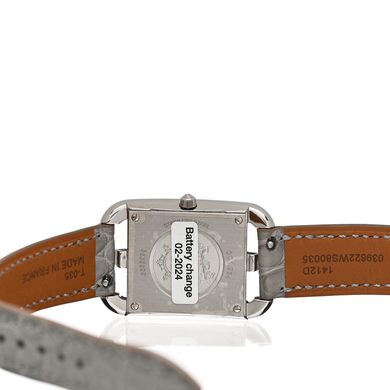 This is an authentic HERMES Stainless Steel Alligator Diamond Grey Sapphire Mother of Pearl 23mm Cape Cod Quartz Watch Pearl Grey. The watch is crafted of stainless steel and features a mother of pearl dial, silver hands, diamond hour markers, diamond and gray sapphire accented bezel, gray alligator strap, sapphire crystal, and a quartz movement.Follow this item for alerts. Hermes is a registered trademark of Hermes. FASHIONPHILE is not affiliated with Hermes.