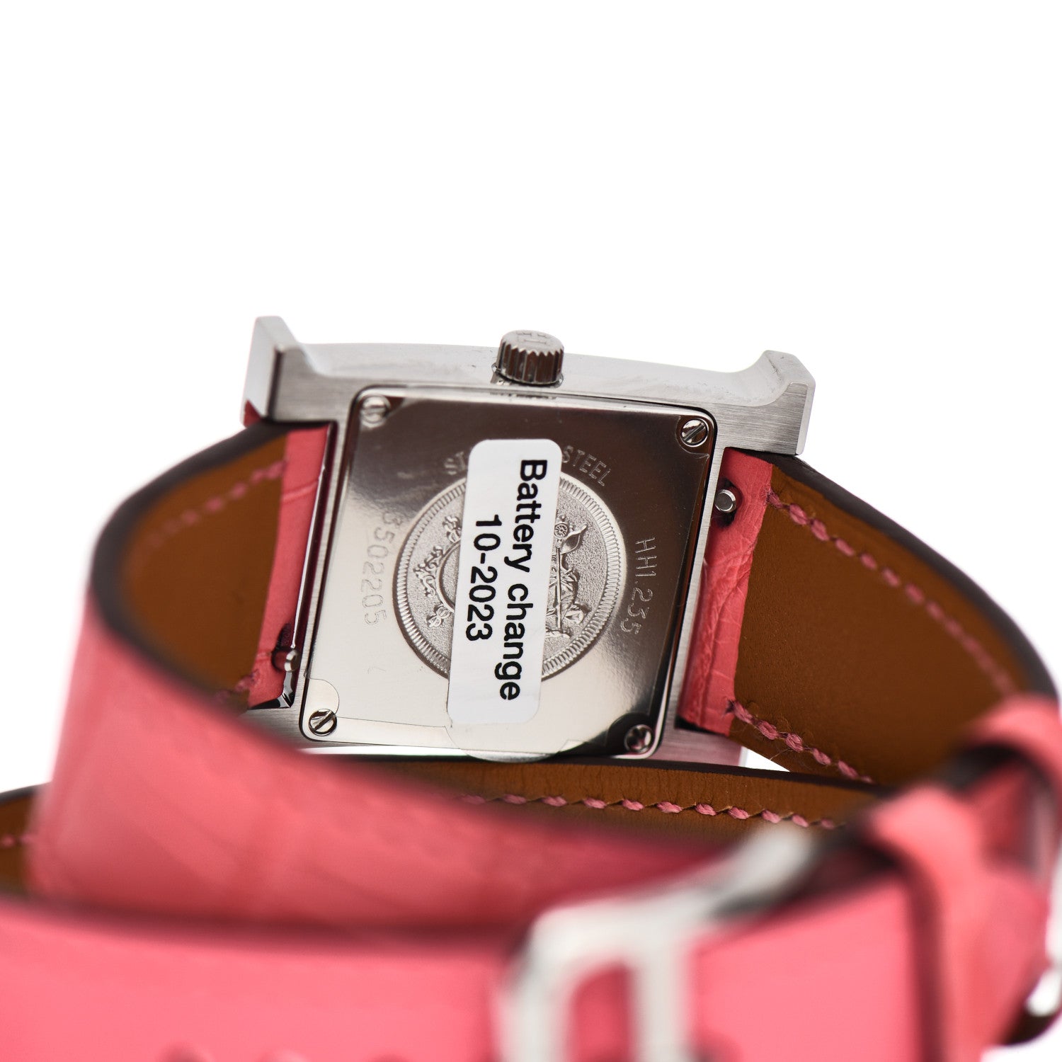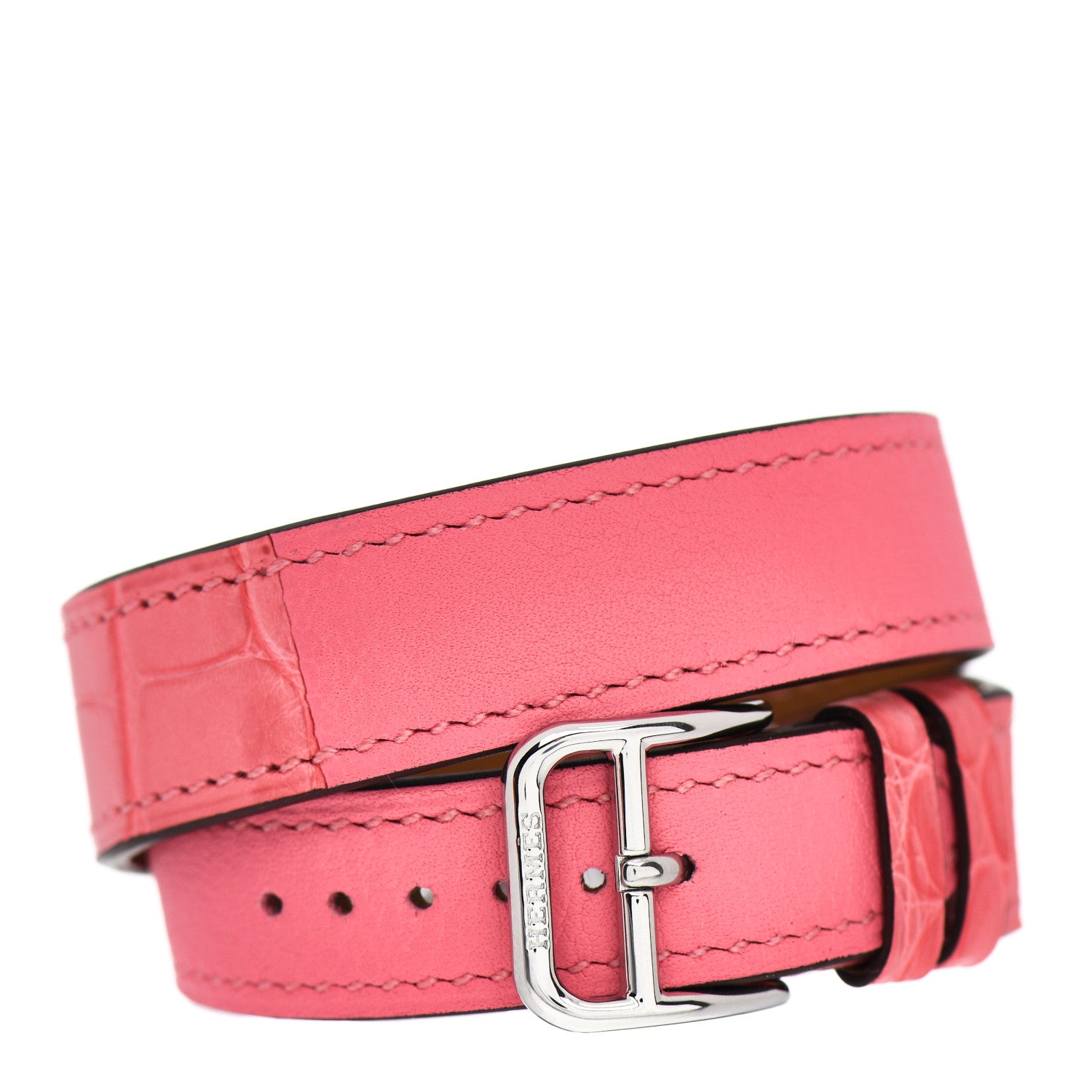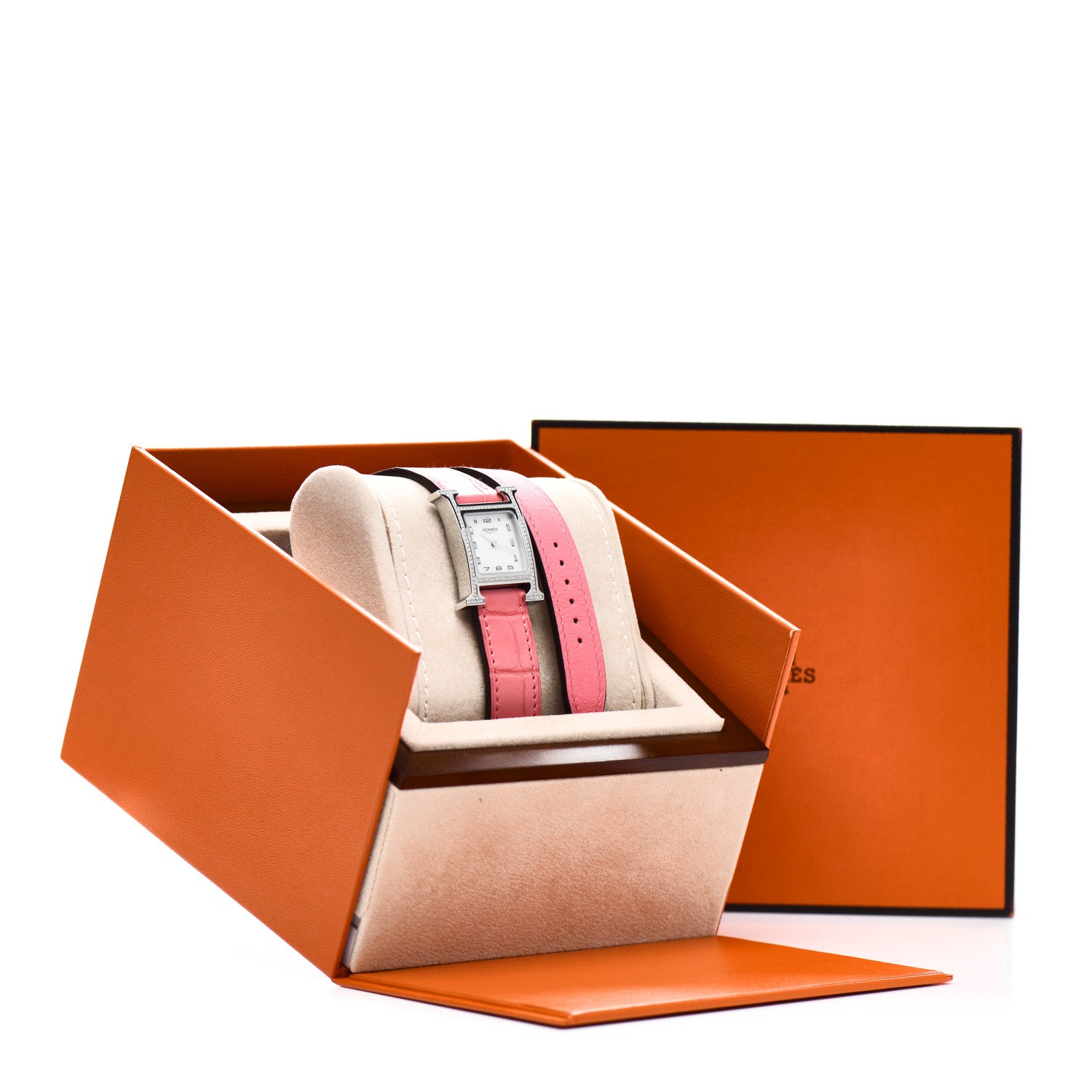 This is an authentic HERMES Stainless Steel Alligator Diamond Bezel Mother of Pearl 21mm Heure H Hour Double Tour Quartz Watch Framboise. This watch is crafted of stainless steel and features a mother of pearl dial, silver hands and black hour markers, pink wrap around alligator strap, diamond bezel approximately .20 total carat weight, sapphire crystal, and a quartz movement.Follow this item for alerts. Hermes is a registered trademark of Hermes. FASHIONPHILE is not affiliated with Hermes.