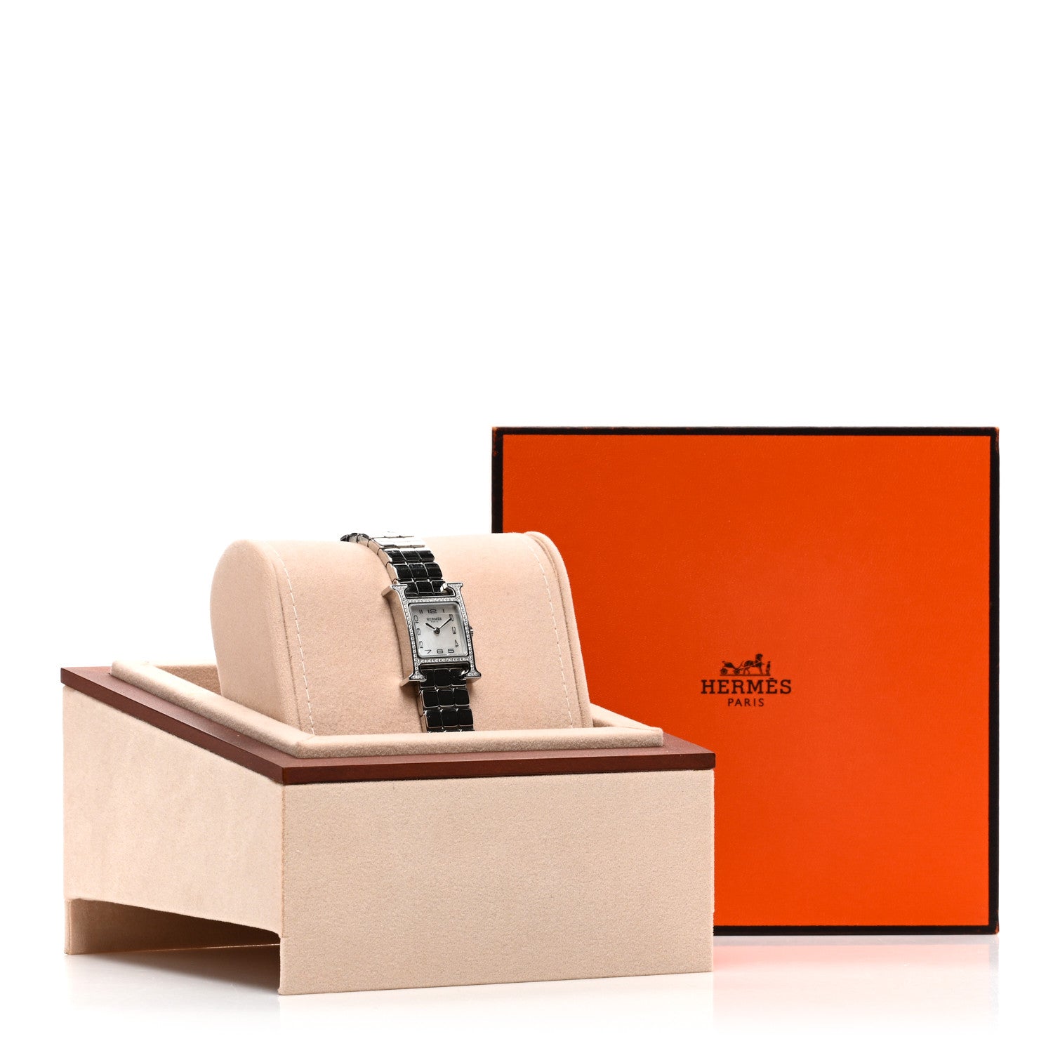 This is an authentic HERMES Stainless Steel Diamond Bezel Mother of Pearl 17.2mm Heure H Hour Quartz Watch. The watch is crafted of stainless steel and features a mother of pearl dial, diamond bezel approximately .24 total carat weight, sapphire crystal, and a quartz movement.Follow this item for alerts. Hermes is a registered trademark of Hermes. FASHIONPHILE is not affiliated with Hermes.