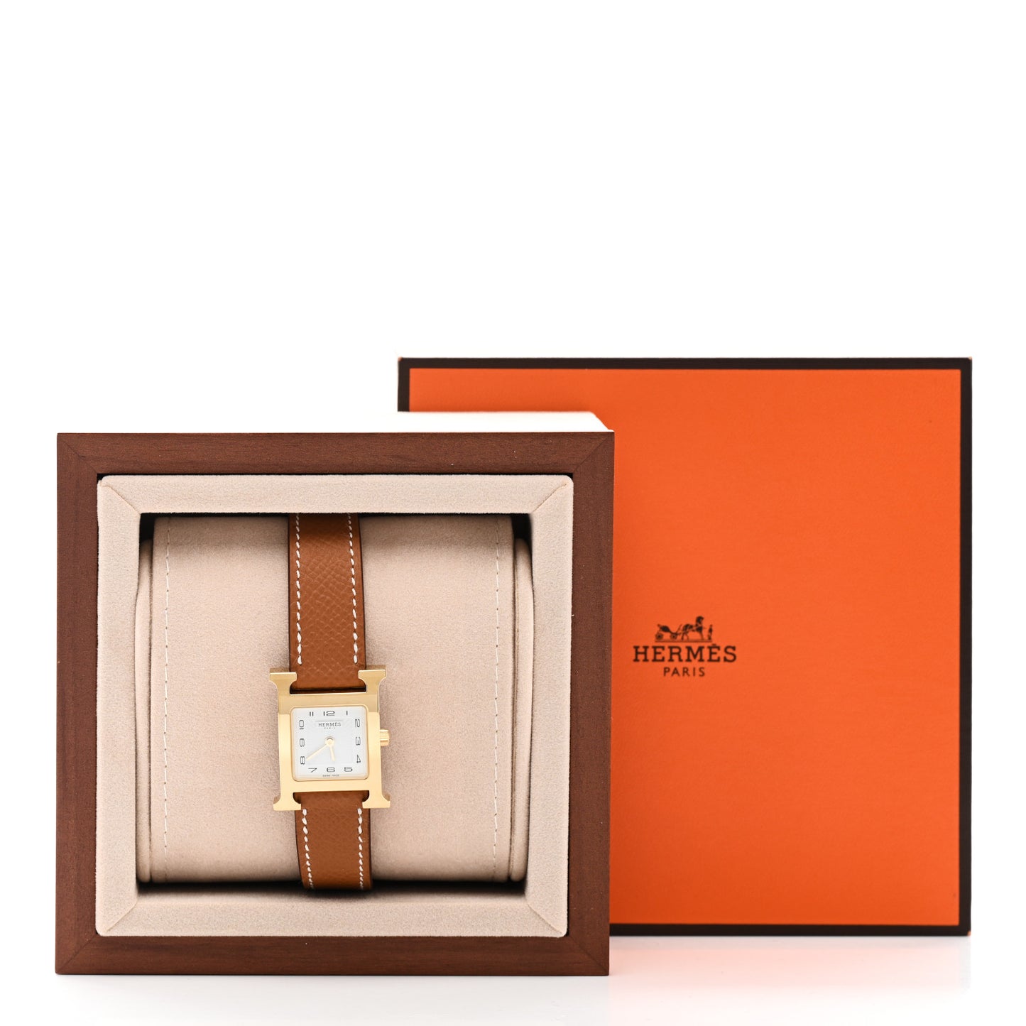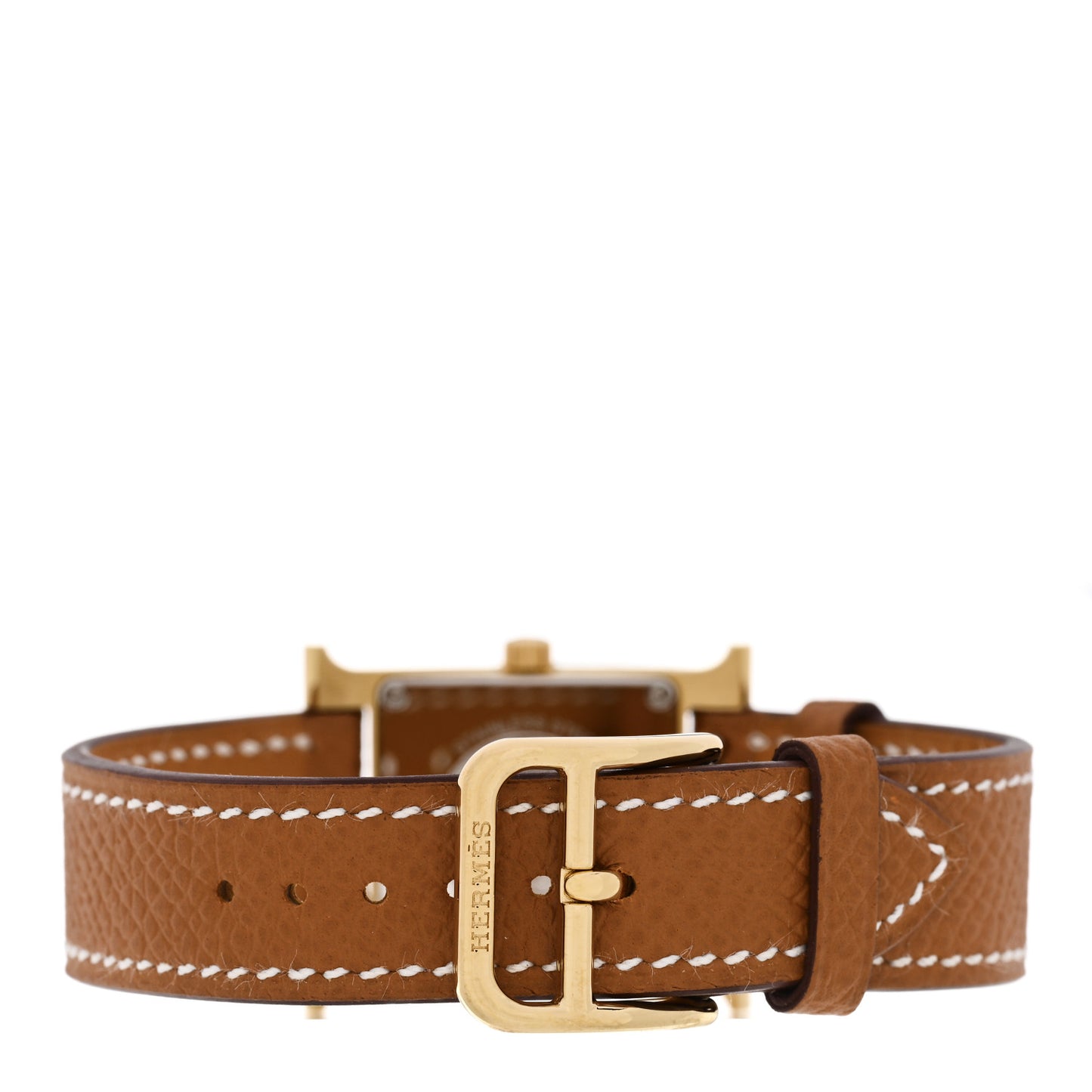 This is an authentic HERMES Stainless Steel Epsom 21mm Heure H Hour Quartz Watch Gold. The watch is crafted of stainless steel and features a white dial, black hour markers, gold hands, brown calfskin strap, sapphire crystal, and a quartz movement.Follow this item for alerts. Hermes is a registered trademark of Hermes. FASHIONPHILE is not affiliated with Hermes.