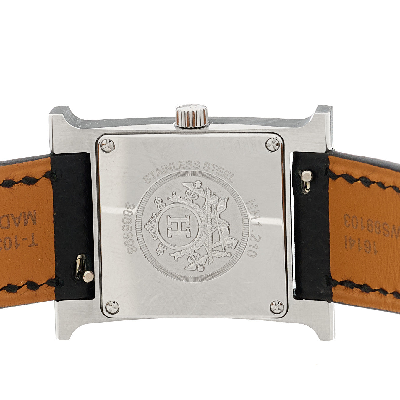 This is an authentic HERMES Stainless Steel Epsom 21mm Heure H Hour Quartz Watch Noir. The watch is crafted of gold plated stainless steel and features a white dial, black calfskin strap, sapphire crystal, and a quartz movement.Follow this item for alerts. Hermes is a registered trademark of Hermes. FASHIONPHILE is not affiliated with Hermes.