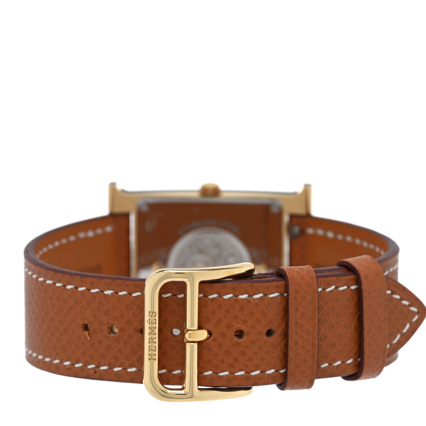 This is an authentic HERMES Stainless Steel Epsom 26mm Heure H Hour Quartz Watch Gold. The watch is crafted of stainless steel and a brown calfskin strap. It features a white dial, gold hands, black hour markers, sapphire crystal, and a quartz movement.Follow this item for alerts. Hermes is a registered trademark of Hermes. FASHIONPHILE is not affiliated with Hermes.