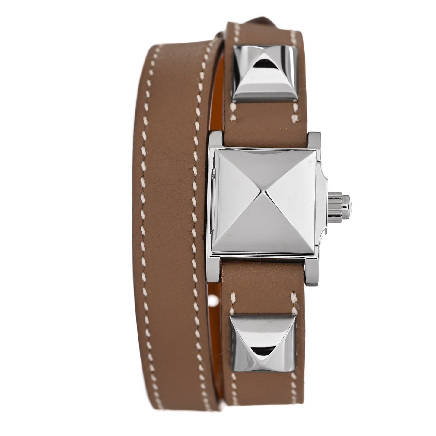 This is an authentic HERMES Stainless Steel Swift 16mm Medor Double Tour Quartz Watch Etoupe. The watch is crafted of stainless steel and features a hidden white dial, grey calfskin strap, sapphire crystal, and a quartz movement.Follow this item for alerts. Hermes is a registered trademark of Hermes. FASHIONPHILE is not affiliated with Hermes.