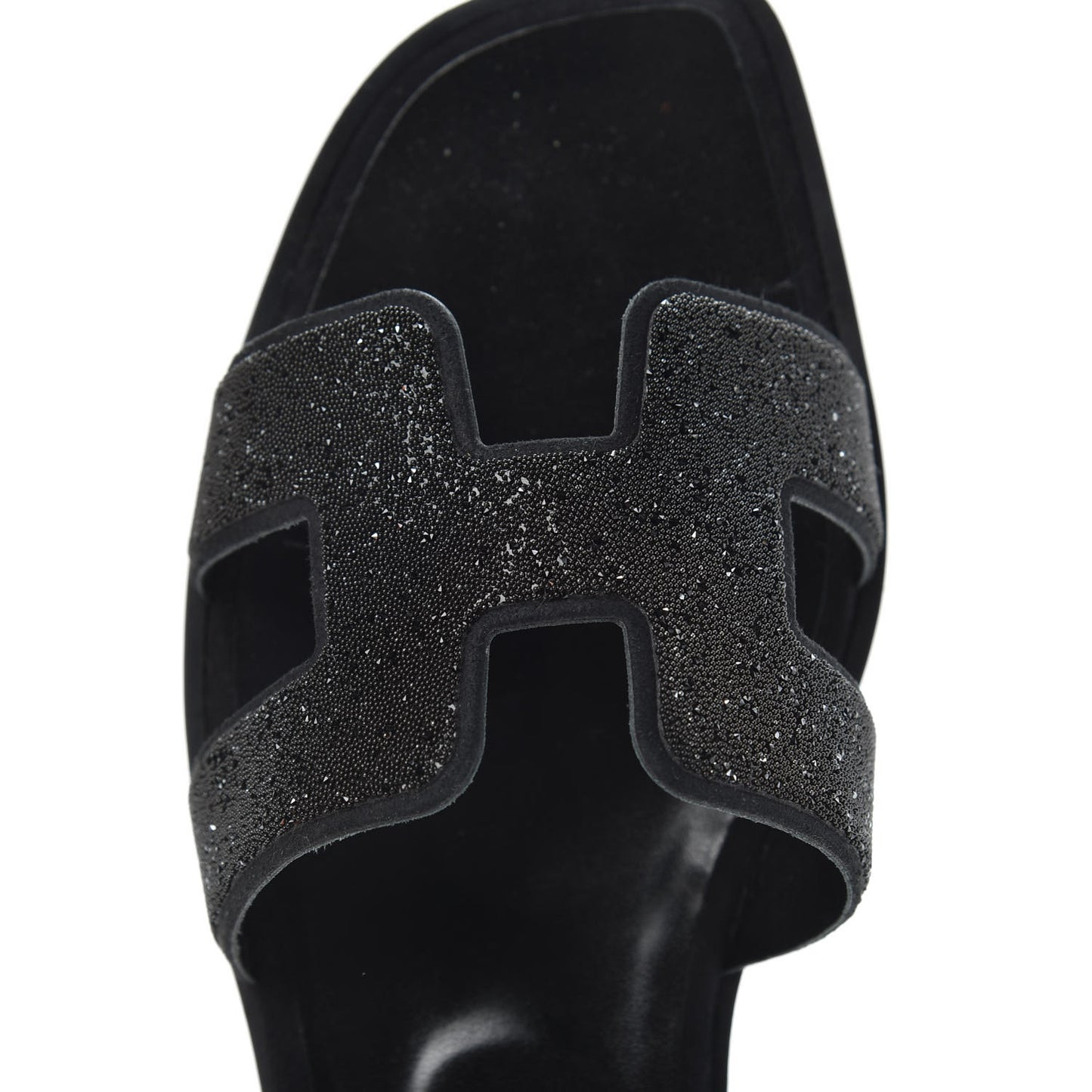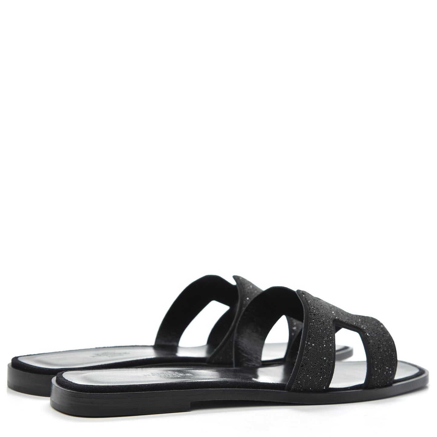 This is an authentic pair of HERMES Suede Goatskin Crystal Powder Oran Sandals size 38.5 in Black. These stunning sandals have a black goatskin leather insole and an Hermes H crossover strap covered in glimmering black crystals.Follow this item for alerts. Hermes is a registered trademark of Hermes. FASHIONPHILE is not affiliated with Hermes.
