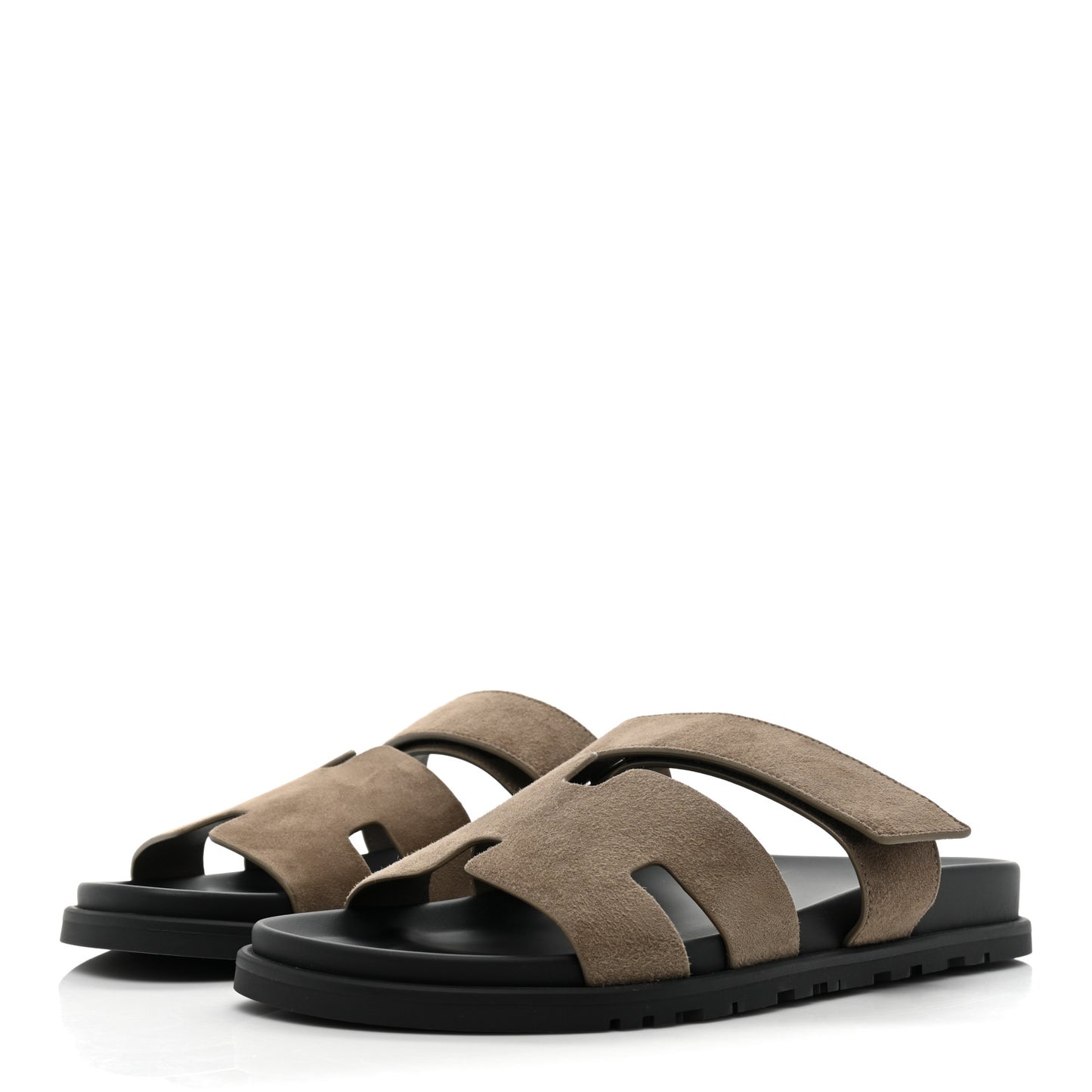 This is an authentic pair of HERMES Suede Goatskin Mens Chypre Sandals size 43 in Beige Argile. These sandals are crafted of suede leather in beige. They feature a toe strap across-over large Hermes H and an adjustable strap.Follow this item for alerts. Hermes is a registered trademark of Hermes. FASHIONPHILE is not affiliated with Hermes.