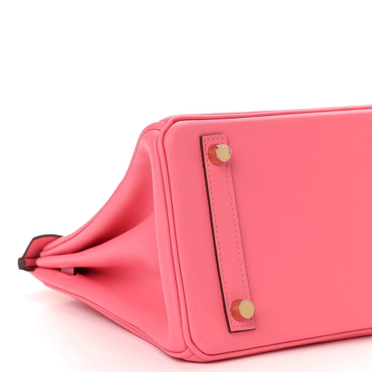 This is an authentic HERMES Swift Birkin 25 in Rose Azalee. This classic handbag is beautifully crafted of supple swift leather with a fine grain in pink. The bag features rolled leather top handles, a frontal flap and strap closure and gold plated hardware including a turn lock and keys in the clochette. This opens to a matte leather interior with pockets.Follow this item for alerts. Hermes is a registered trademark of Hermes. FASHIONPHILE is not affiliated with Hermes.
