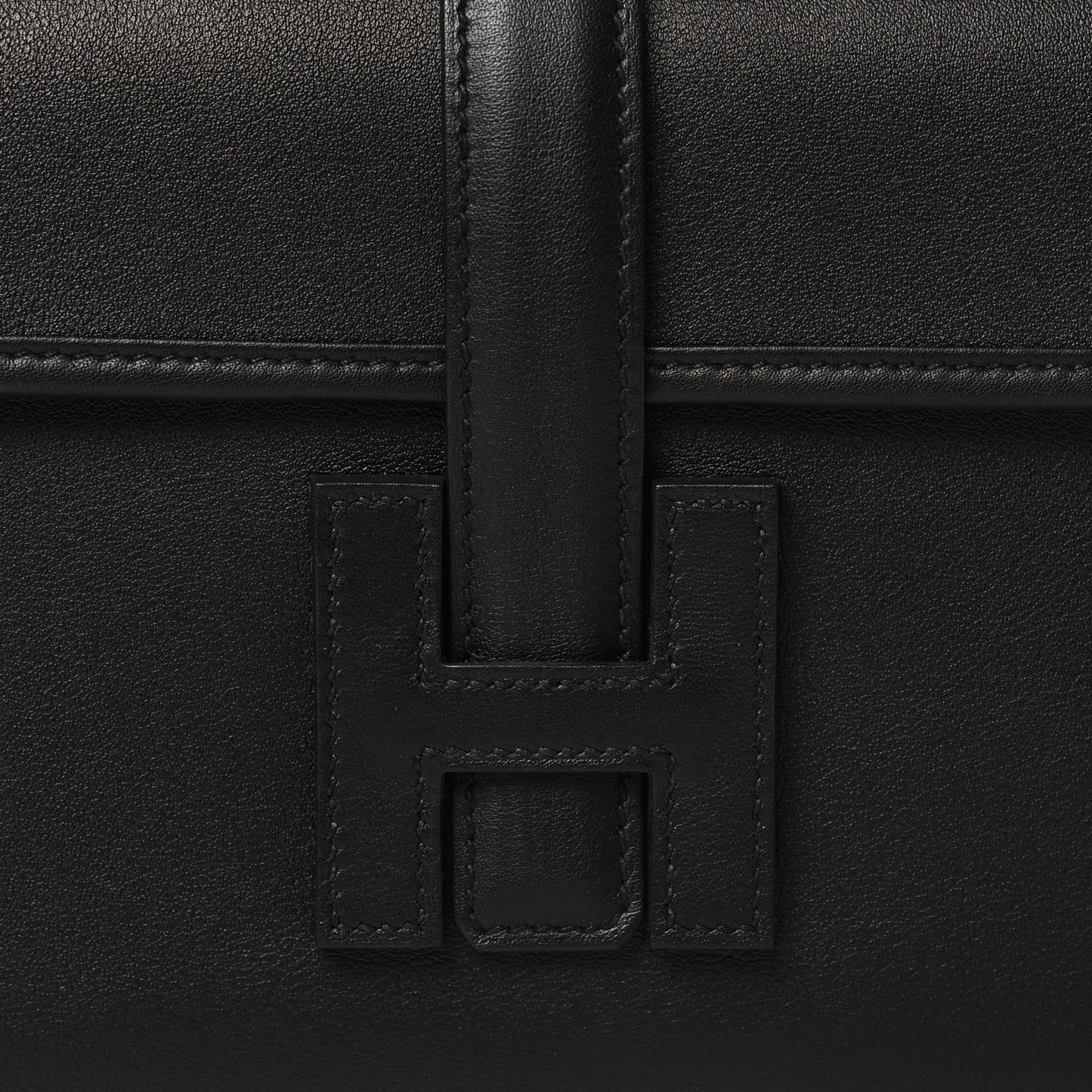 This is an authentic HERMES Swift Jige Elan 29 Clutch in Black. This stylish clutch is crafted of luxurious swift calfskin leather in black. It features a cross-over flap with a strap that tucks under a leather Hermes "H." This opens to a black leather interior.