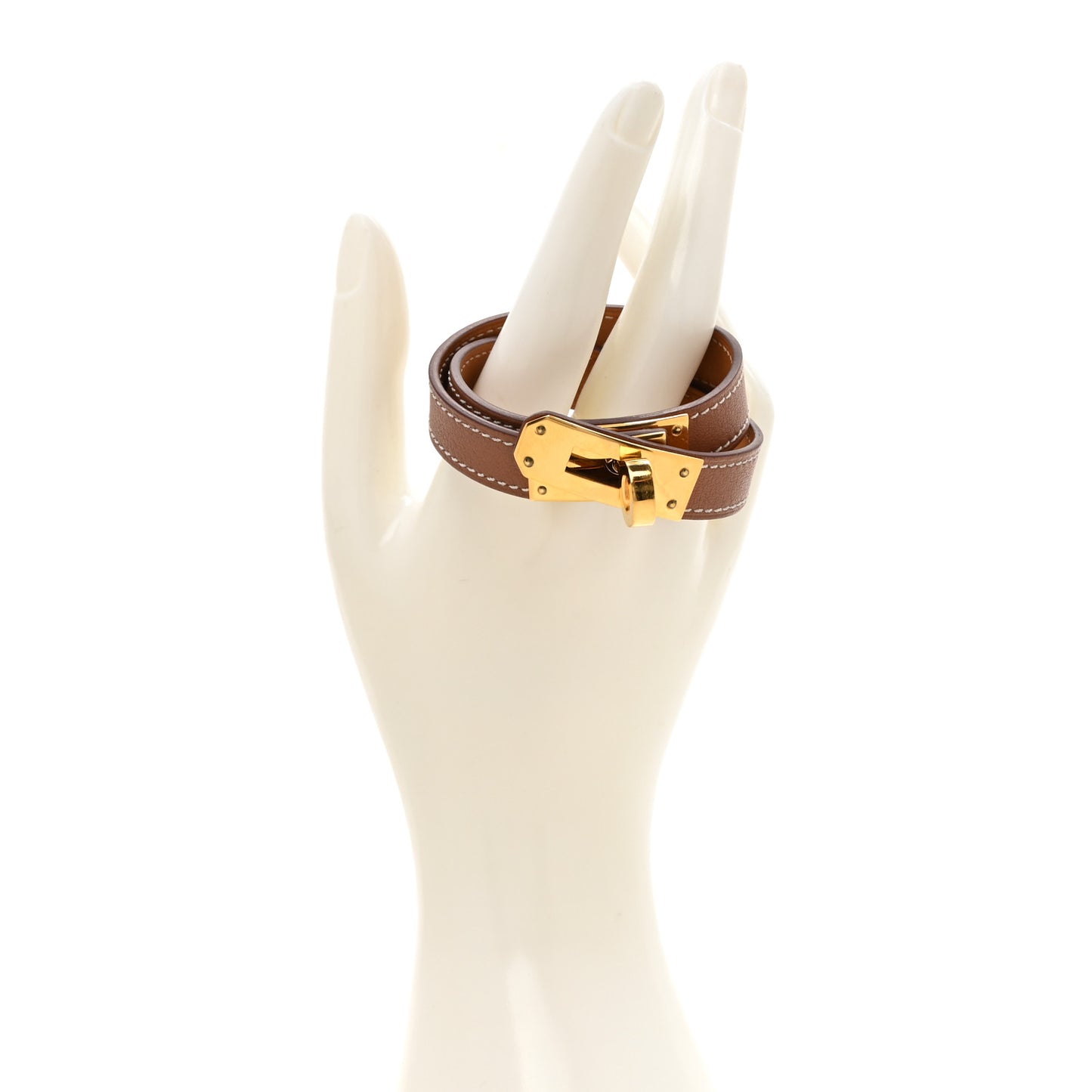 This is an authentic HERMES Swift Kelly Double Tour Bracelet size T3 in Gold. This exceptional bracelet is crafted of smooth brown calfskin leather with a gold plated end that wraps around the wrist twice, a "Double Tour", and seals with a gold-plated signature Kelly turn-lock closure at the other end.Follow this item for alerts. Hermes is a registered trademark of Hermes. FASHIONPHILE is not affiliated with Hermes.
