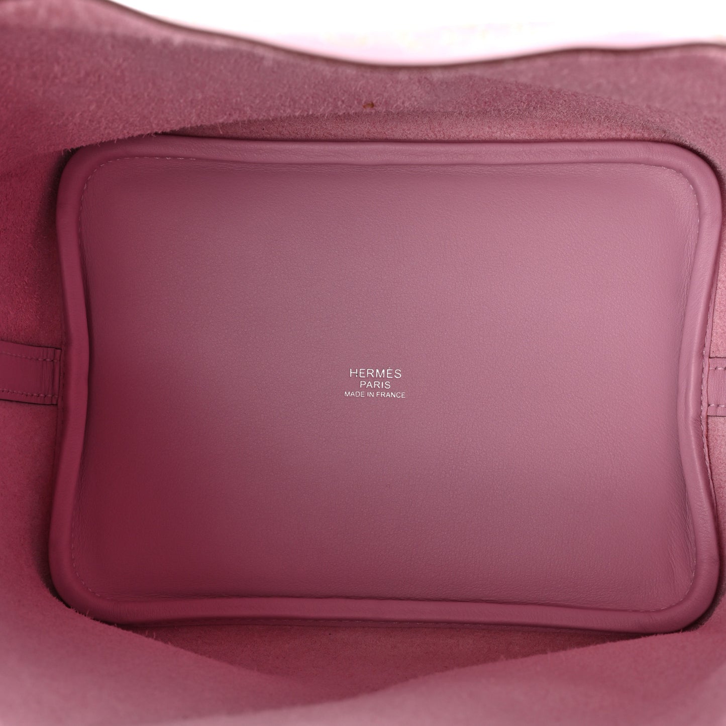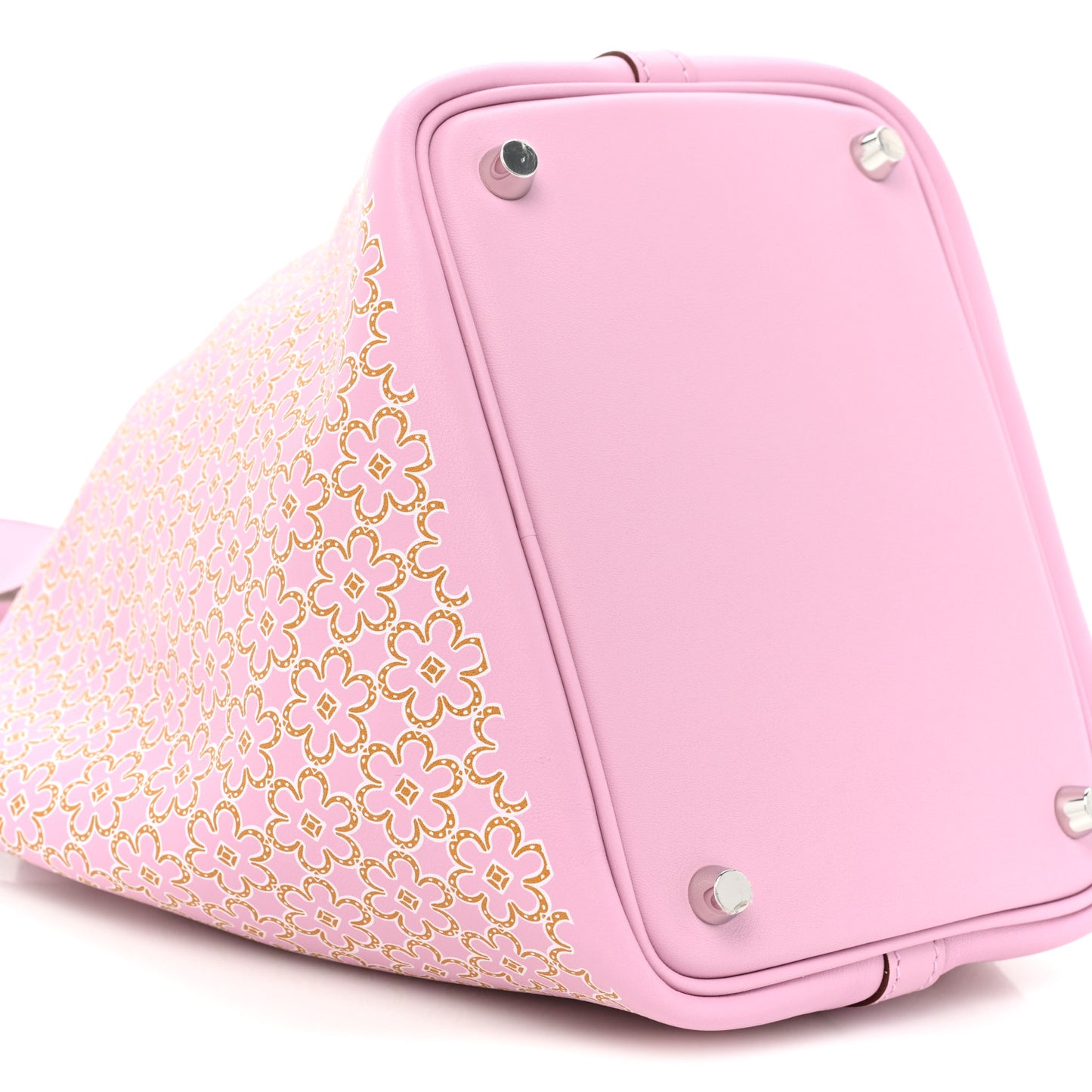 This is an authentic HERMES Swift Lucky Daisy Picotin Lock 18 PM in Mauve and Sylvestre. This chic tote is crafted of Swift calfskin leather in pink with a floral print. This one-piece handbag features strap handles that extend from the sides with an extra layer of leather for support and palladium silver hardware. The handbag opens to a spacious pink interior and can be secured with the included padlock.Follow this item for alerts. Hermes is a registered trademark of Hermes. FASHIONPHILE is not affiliated with Hermes.