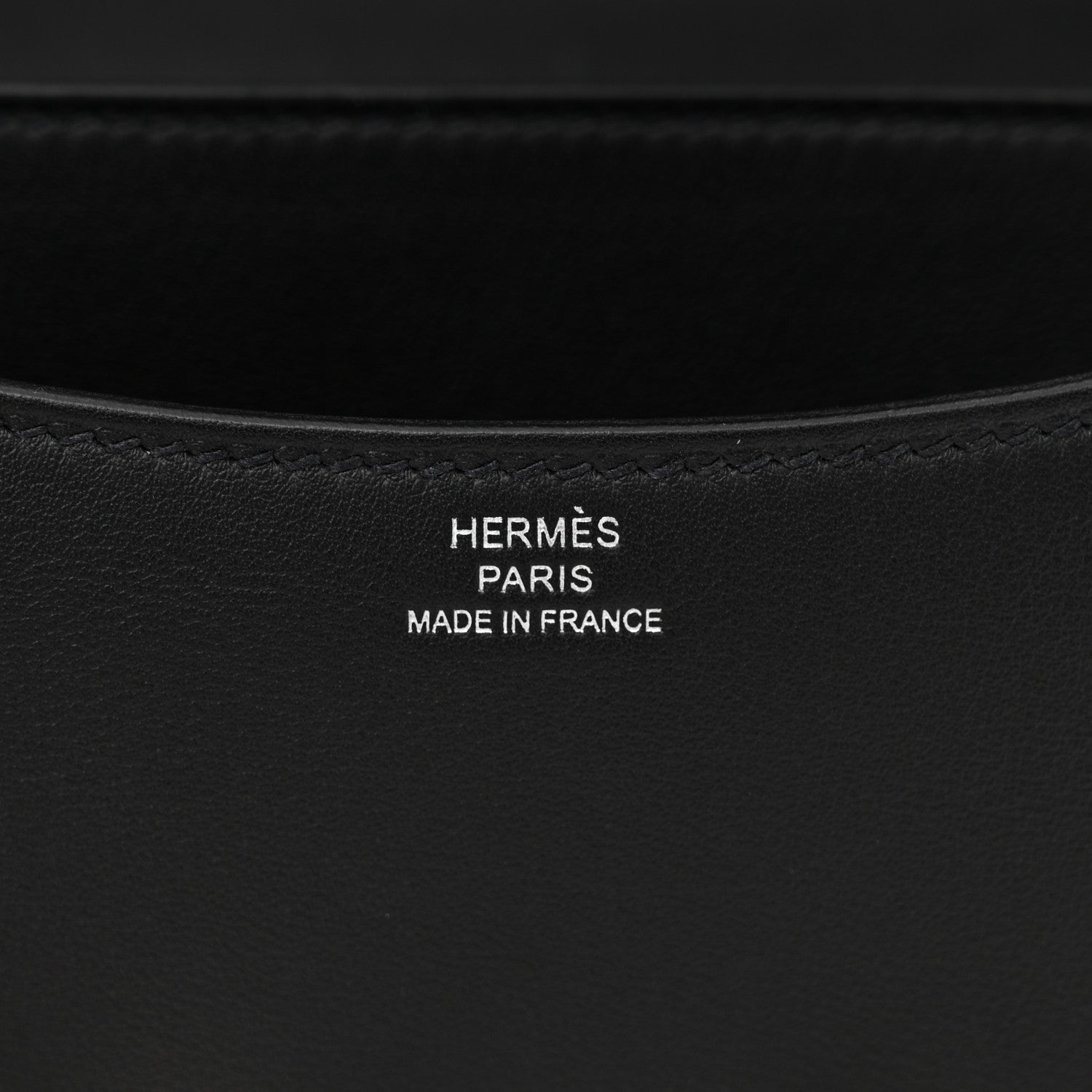 This is an authentic HERMES Swift Marble Constance 18 Black. This is a chic small bag that is finely crafted of luxurious smooth leather in black. The shoulder bag features a leather shoulder strap, a front flap, and a palladium Hermes H logo with a unique design. The flap opens to a partitioned leather interior with a patch pocket.Follow this item for alerts. Hermes is a registered trademark of Hermes. FASHIONPHILE is not affiliated with Hermes.
