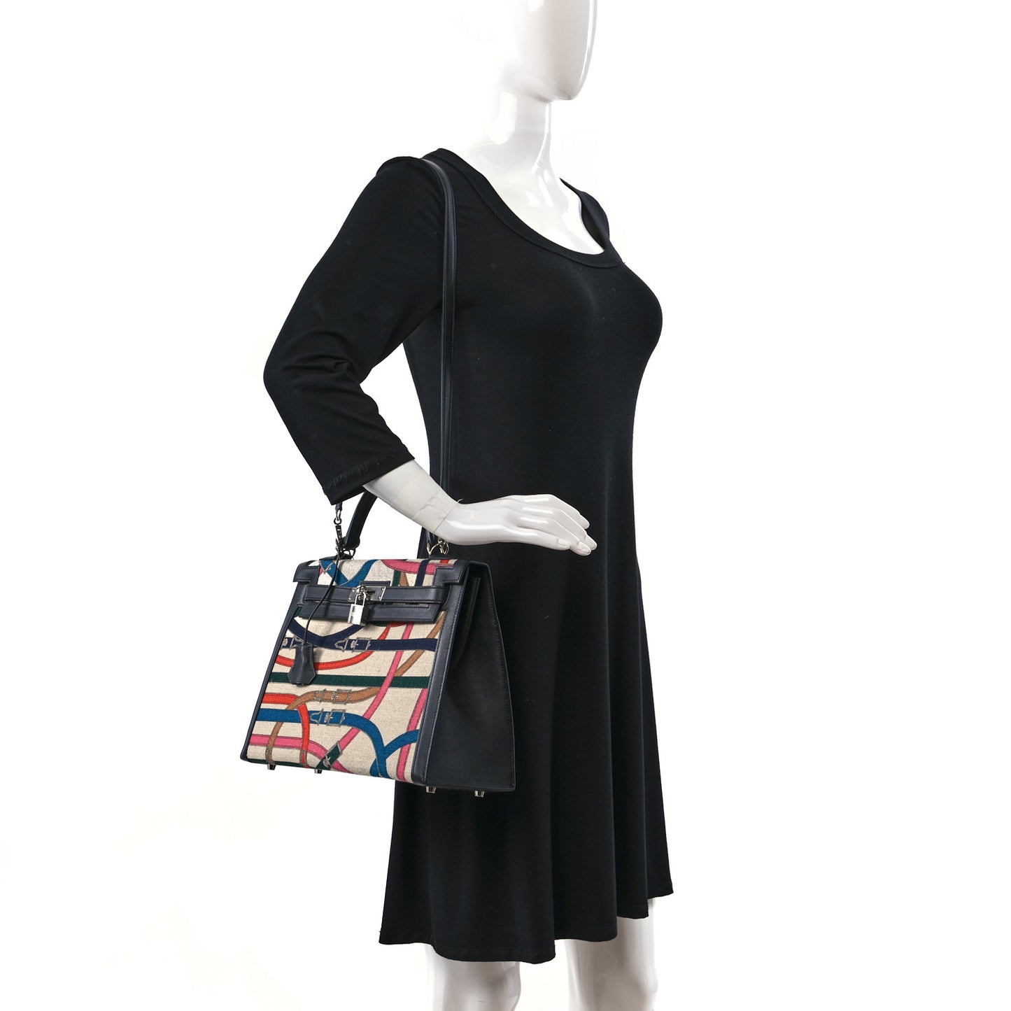 This is an authentic HERMES Swift Toile De Camp Cavalcadour Kelly Sellier 32 in Black. This attractive Kelly tote is crafted of natural toile canvas and polished calfskin leather trim. The bag features a rolled leather top handle with polished palladium links and a cross-over flap with strap closure and a polished palladium Kelly turn lock. This opens to a leather interior with a zipper and patched pockets.Follow this item for alerts. Hermes is a registered trademark of Hermes. FASHIONPHILE is not affiliated with Hermes.