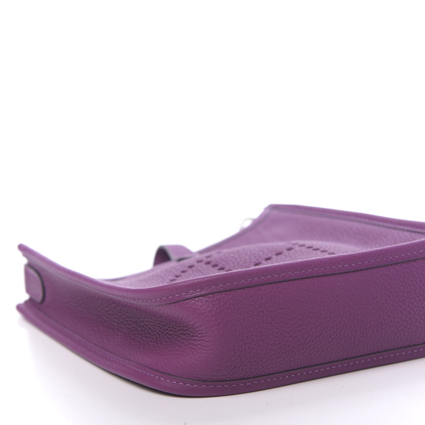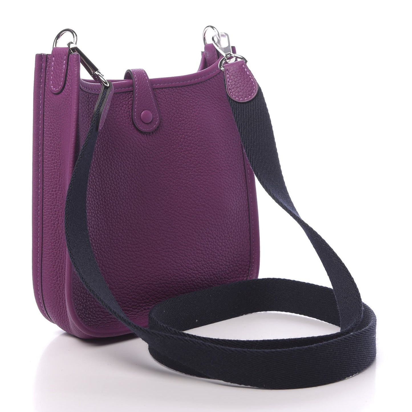 This is an authentic HERMES Taurillon Clemence Amazone Evelyne TPM Anemone and Marine. This stylish messenger bag is crafted of textured Taurillon Clemence calfskin leather in vibrant purple. It features a perforated Hermes H oval logo on the front and a dark blue canvas crossbody strap with palladium hardware. The top opens with a crossover strap to a purple suede interior. This is a perfect messenger bag, ideal for everyday essentials, from Hermes!